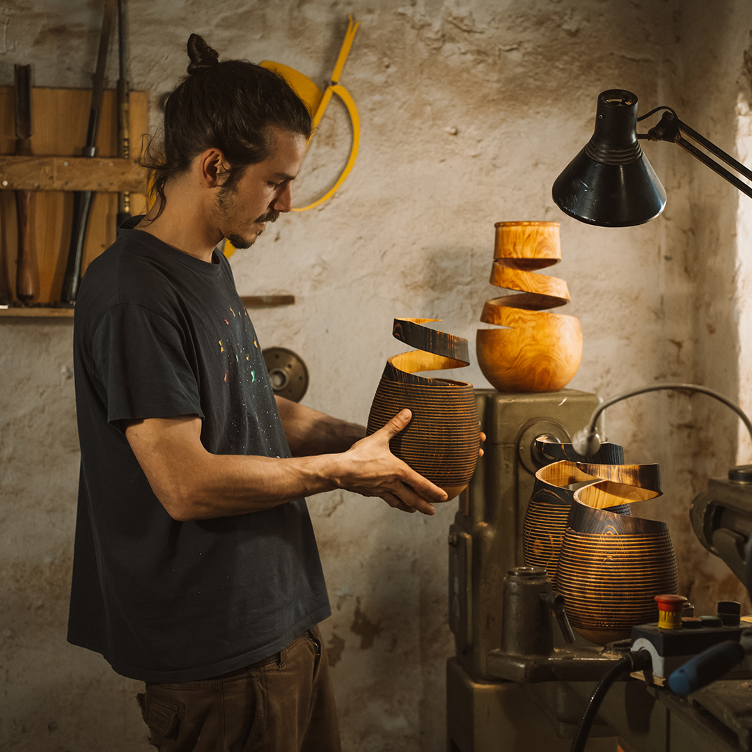 Leonardo Cappellini è un artigiano del legno specializzato in tornitura e scultura contemporanea. Dopo il liceo scientifico si laurea in Design all’Università di Firenze nel 2018, ma già durante gli studi scopre la tornitura: un’intuizione nata quasi per caso che diventa subito passione e poi professione. Trasformata l’autorimessa di famiglia nel primo laboratorio, oggi lavora e vive a Pontassieve, alle porte di Firenze, in una casa in pietra immersa nella natura che ospita anche la sua bottega Leowoodart.