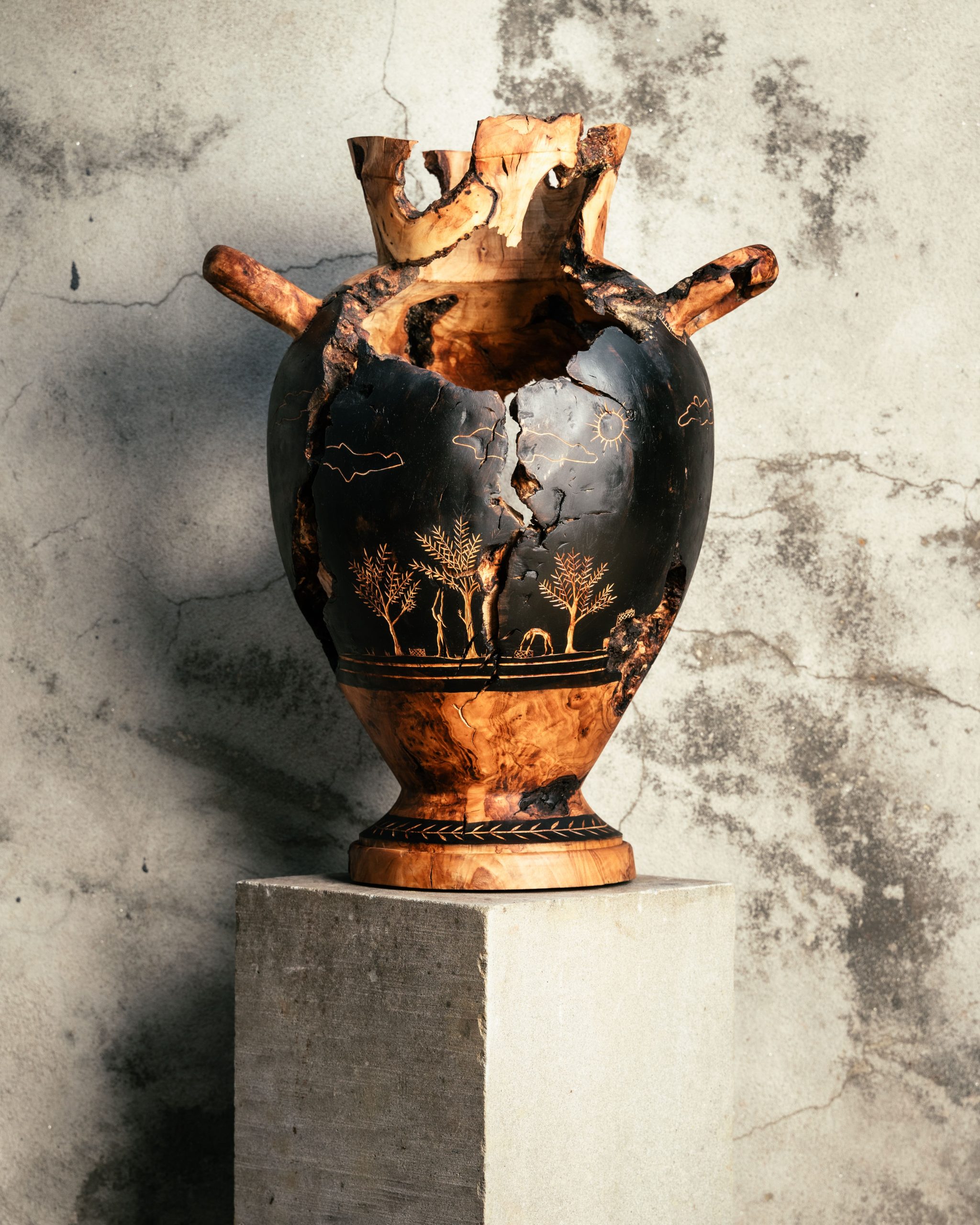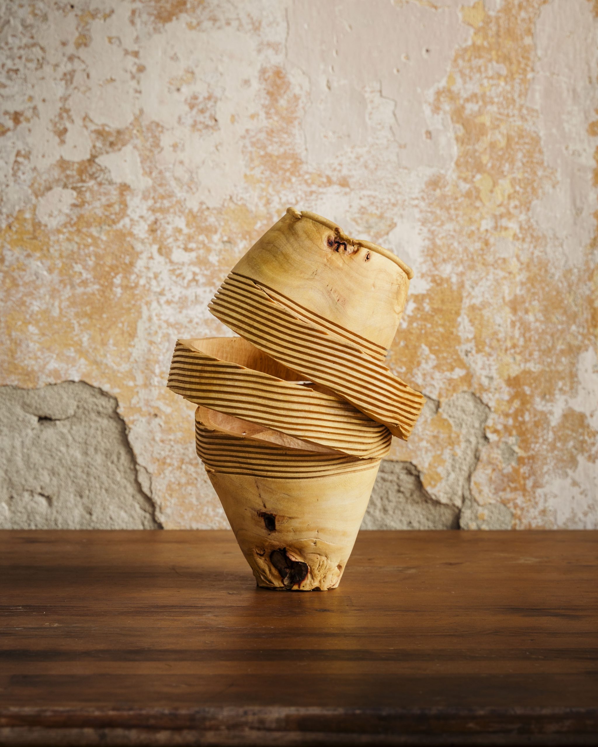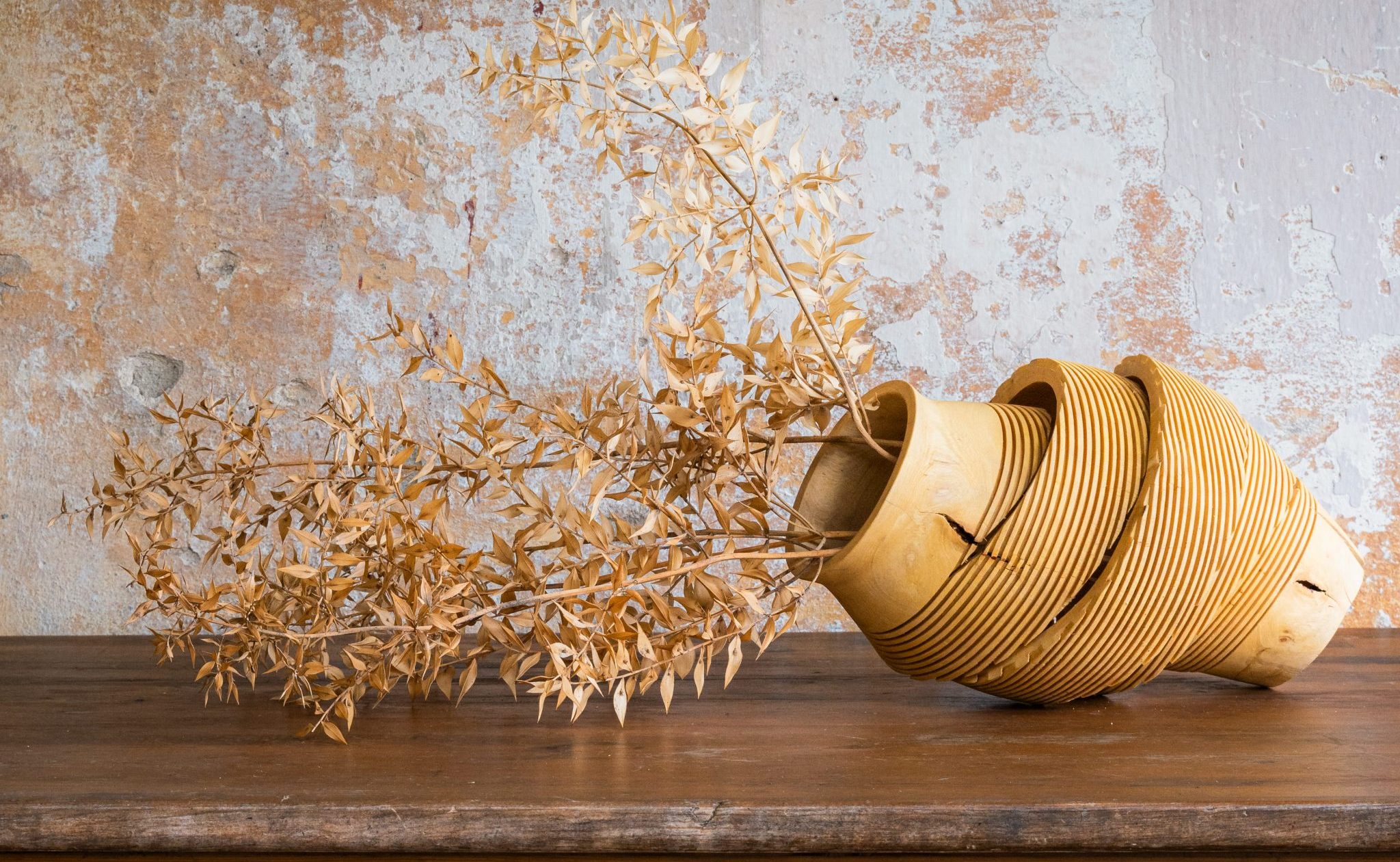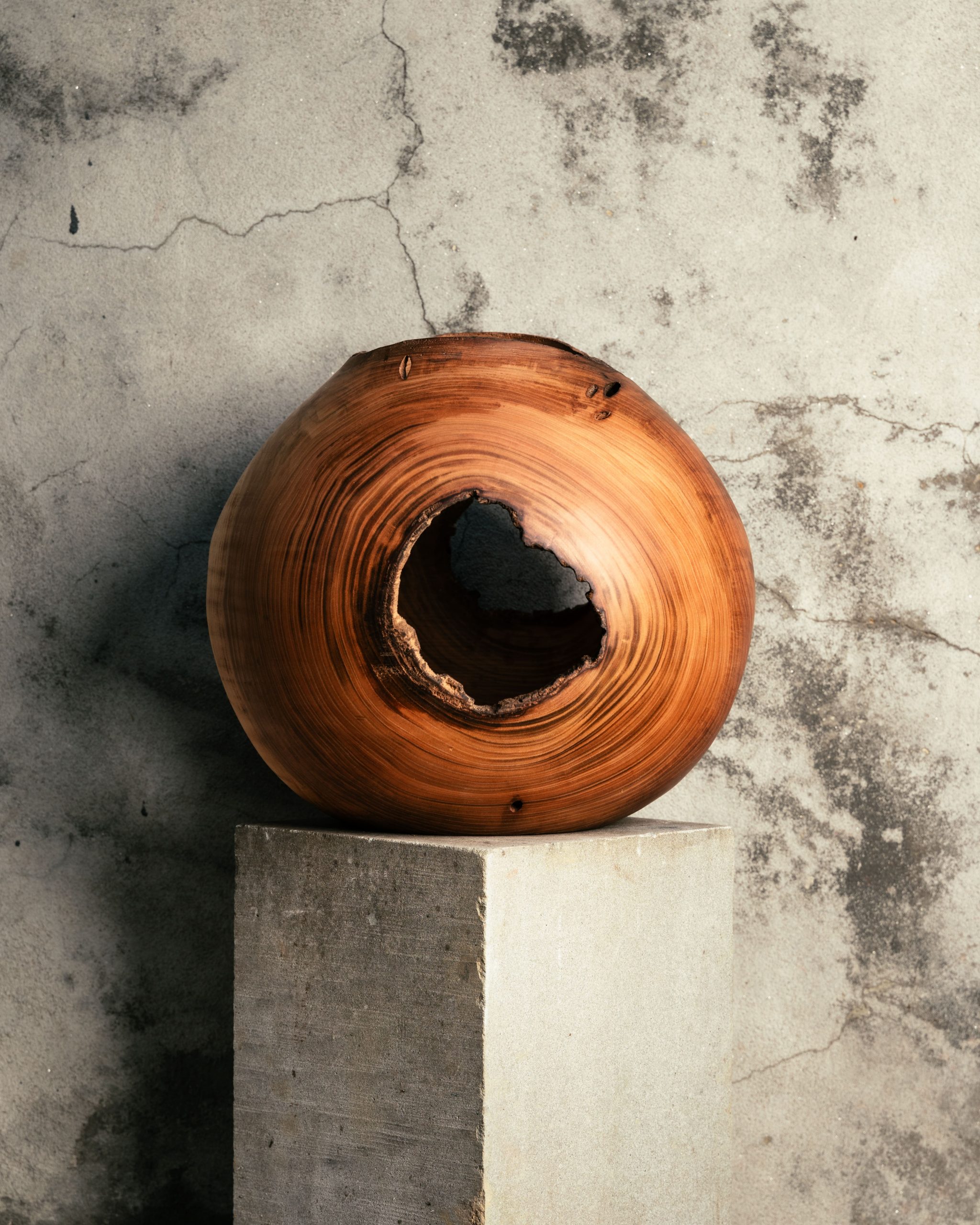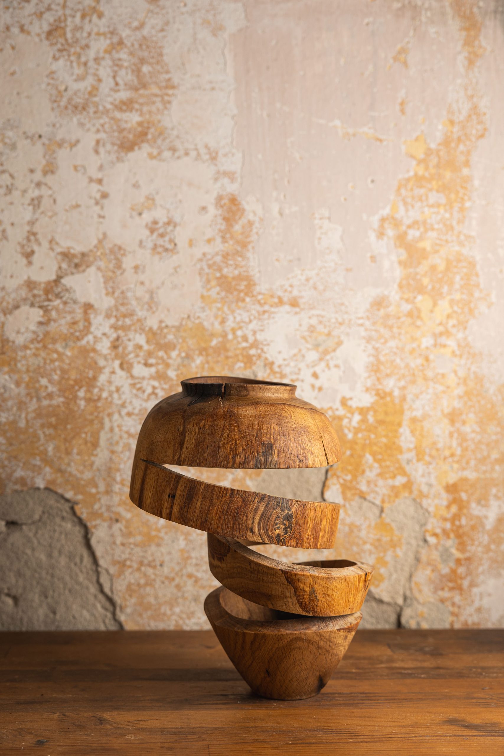 La sua ricerca nasce dal desiderio di dare nuova vita a ciò che la natura abbandona: tronchi malati, rami storti, legni segnati dal tempo. Il tornio è il cuore del suo lavoro, ma ogni pezzo prende forma dall’incontro tra la materia e la sua interpretazione artistica. Vasi-scultura e complementi d’arredo nascono da legni locali e di recupero, spesso provenienti da abbattimenti o da alberi donati per preservarne la memoria. Ogni imperfezione viene accolta come segno vitale, non nascosta, così da trasformare l’oggetto in una testimonianza del tempo e della trasformazione.