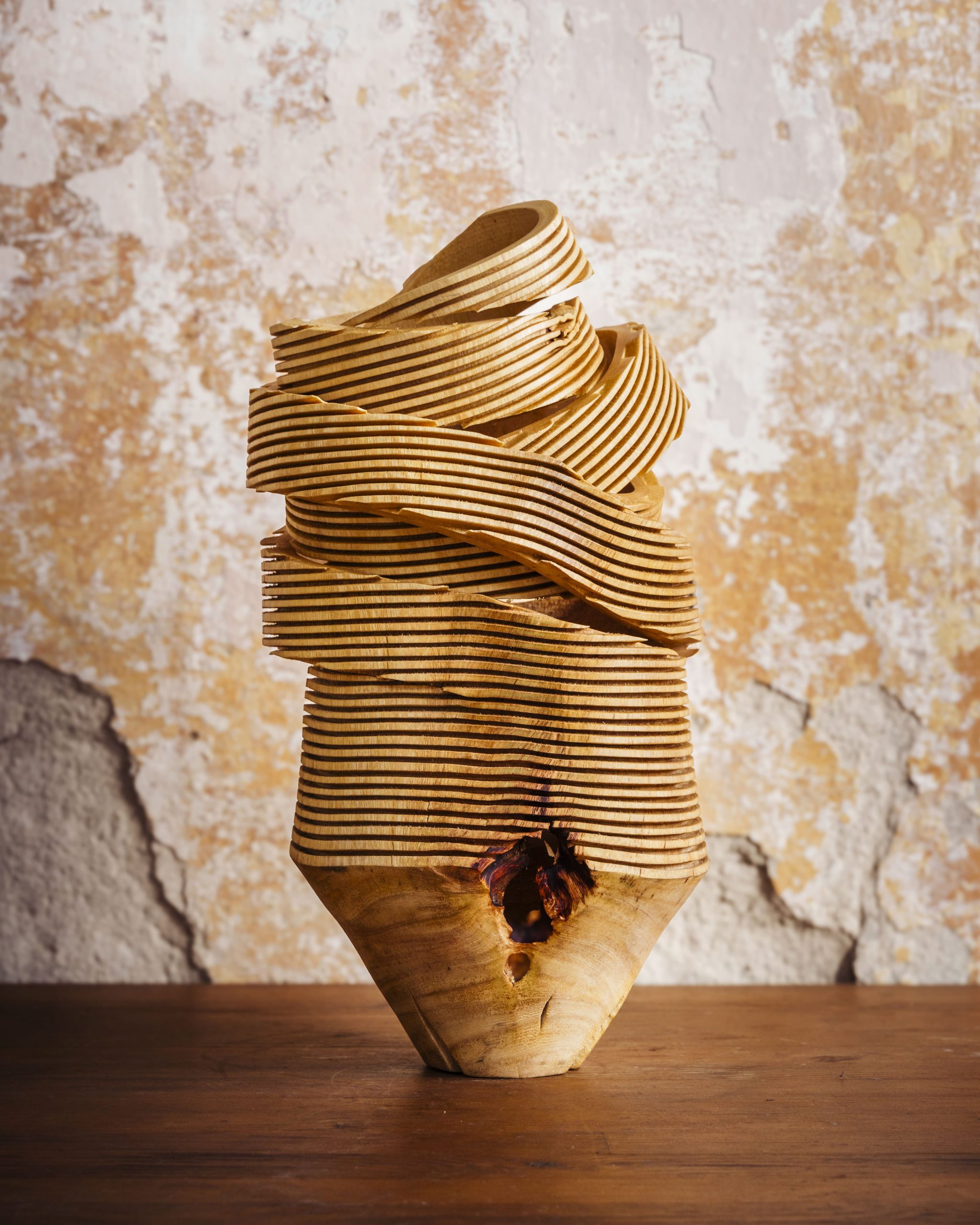 Leonardo predilige il legno fresco, capace di deformarsi e muoversi mentre perde umidità: un dialogo continuo che alimenta la sua ricerca sulle forme e sulle texture. Alle tecniche di tornitura affianca scultura e pirografia, per opere che uniscono tradizione artigianale e linguaggio contemporaneo. Collabora con privati, gallerie e studi di architettura, ed è stato protagonista di mostre ed esposizioni dedicate all’artigianato d’arte.