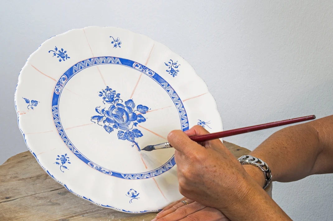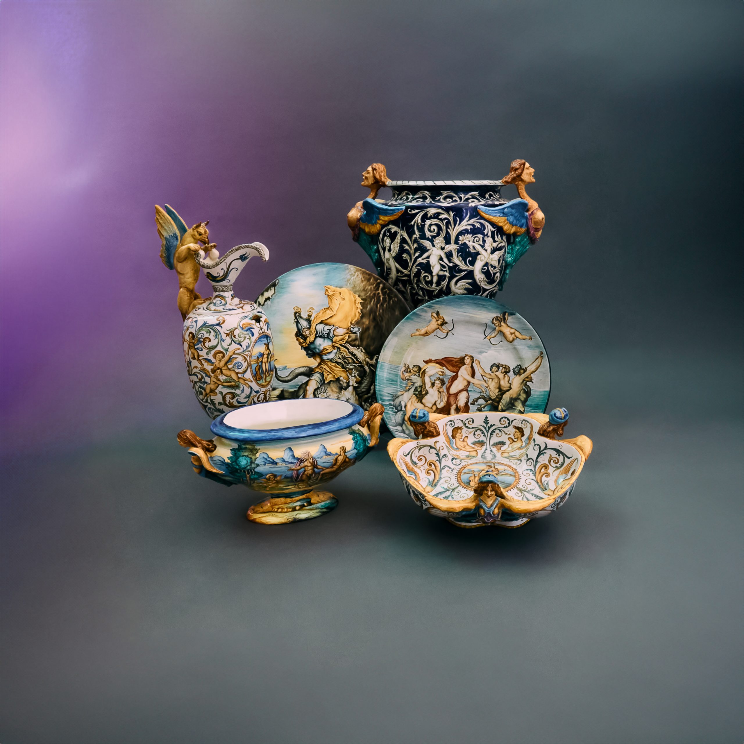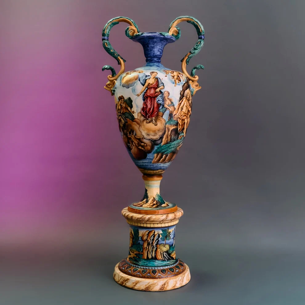 La manifattura Ceramiche Artistiche Molaroni è stata fondata a Pesaro nel 1880 e continua a operare nella sede storica, mantenendo intatto il legame con la tradizione della maiolica locale. Fin dagli inizi, il laboratorio ha sviluppato un linguaggio formale riconoscibile, fondato su una lavorazione interamente manuale e su un repertorio decorativo che nel tempo si è arricchito grazie al contributo di maestri modellatori e pittori. La continuità produttiva, attraversando generazioni, ha permesso di conservare non solo tecniche consolidate — modellazione a mano o al tornio, smaltatura e decorazione a pennello con cotture successive — ma anche un archivio di forme e motivi che documenta l’evoluzione stilistica dell’officina.