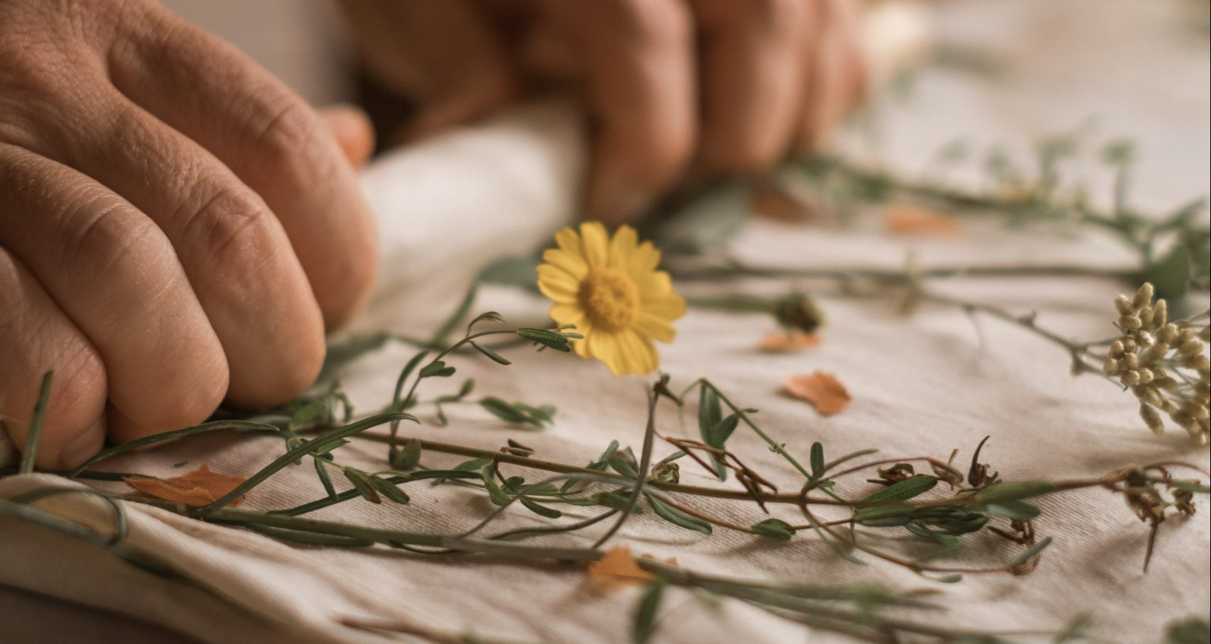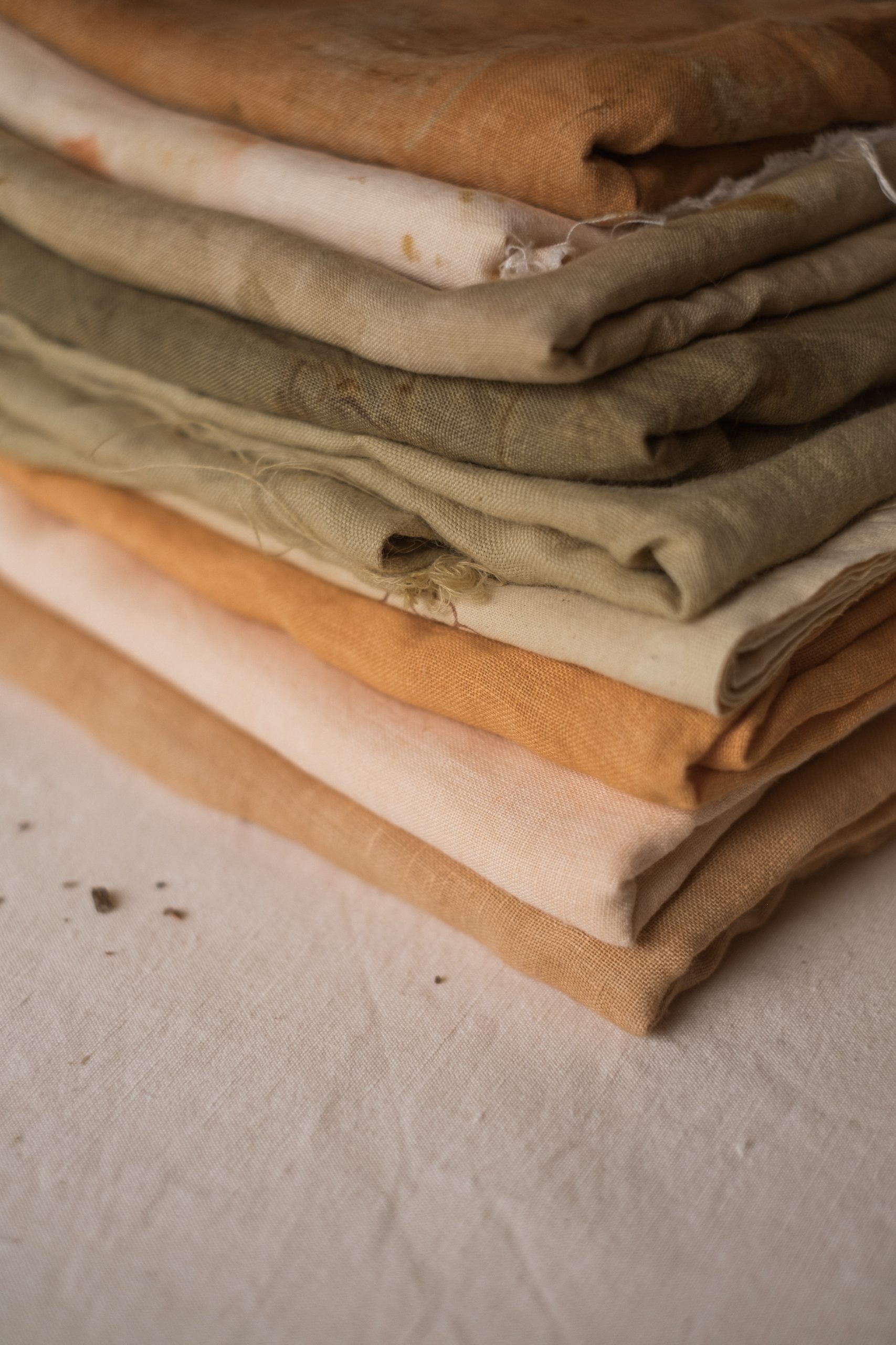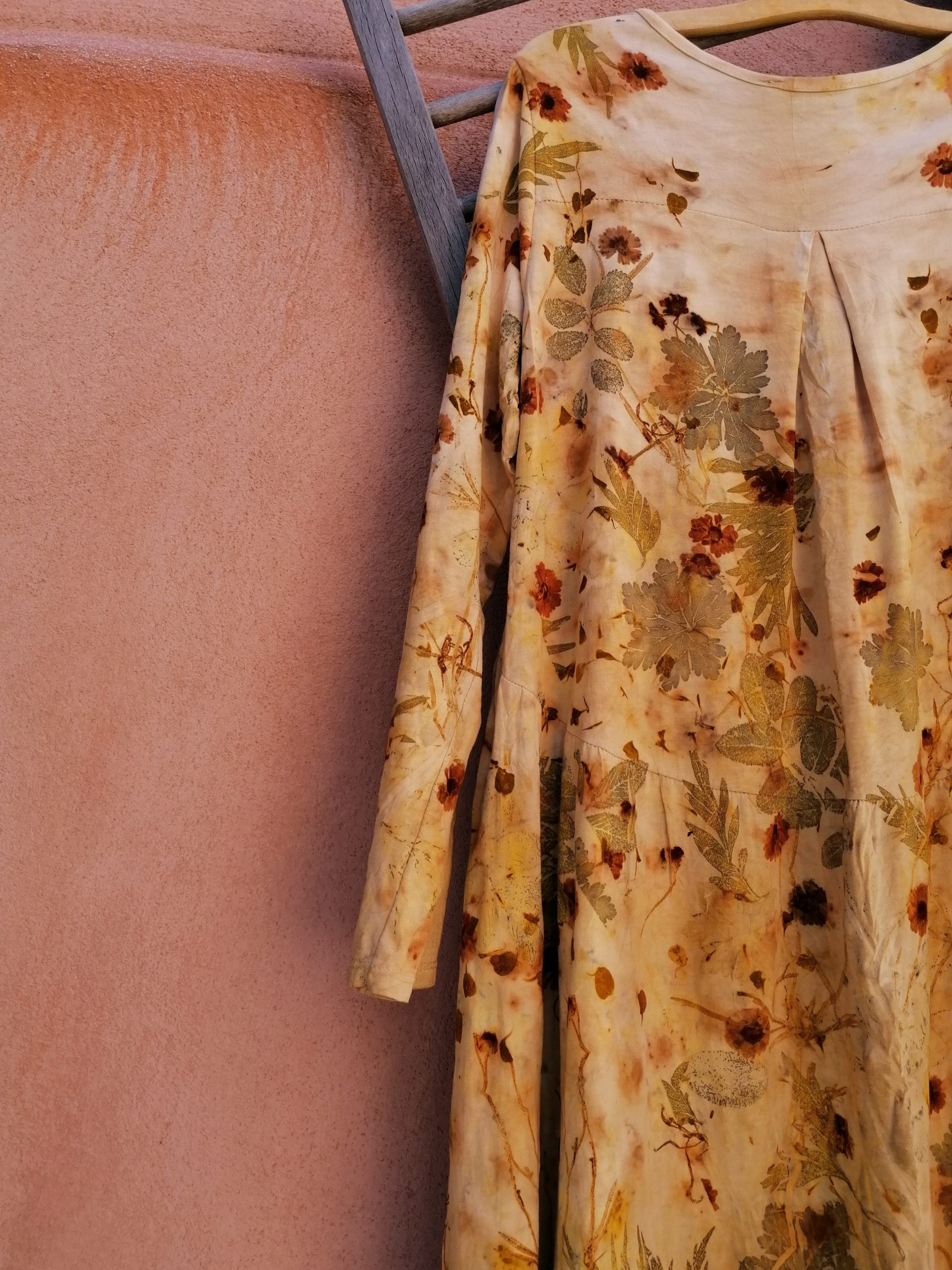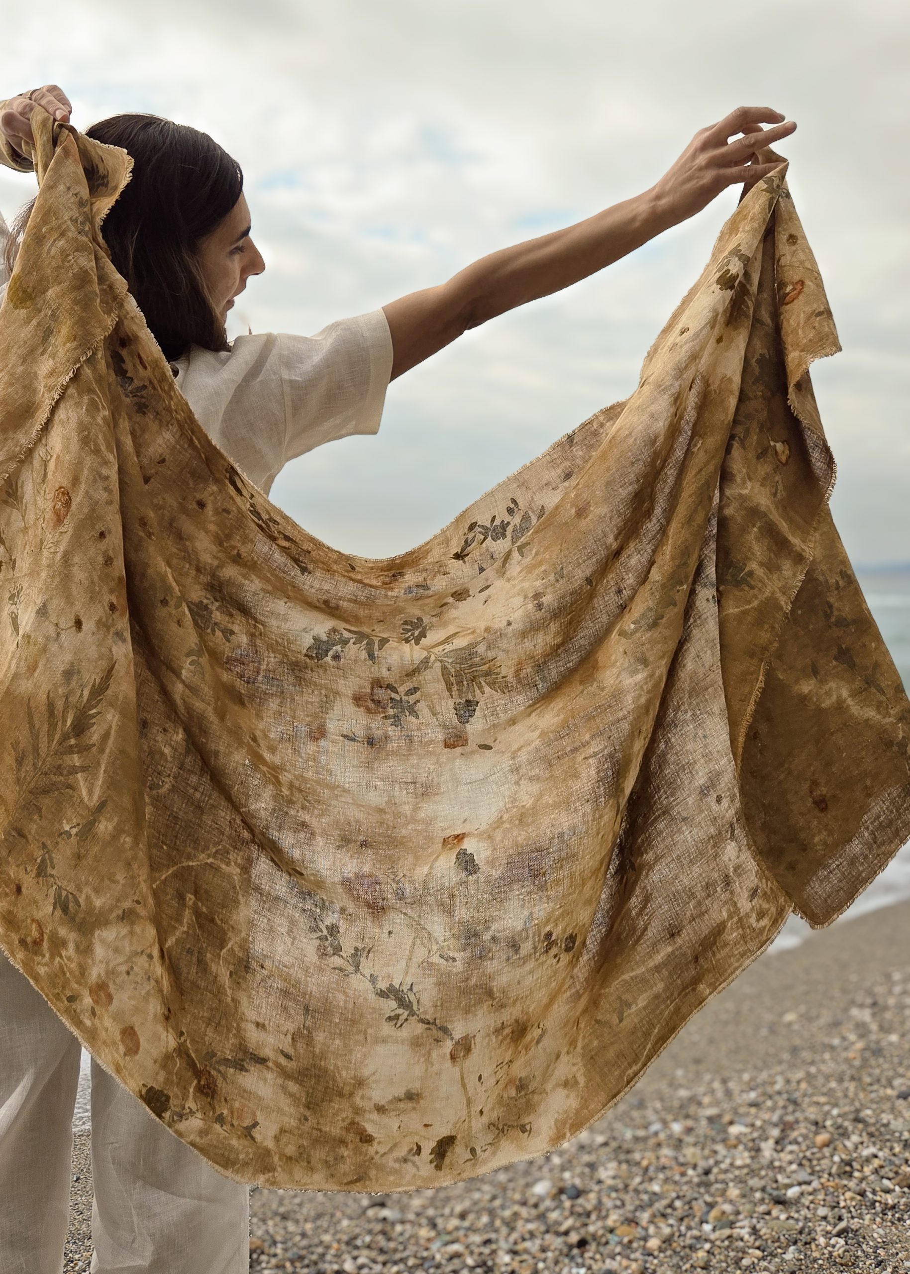 Le tinture sono realizzate con pigmenti naturali estratti da piante coltivate o raccolte localmente, oltre che da scarti vegetali forniti da aziende agricole e florovivaistiche. L’intero processo segue una logica Zero Waste, che valorizza ogni residuo tessile o botanico.