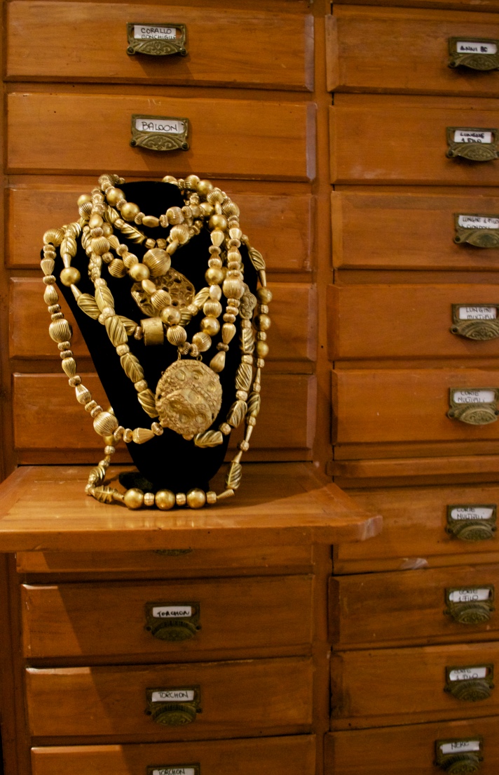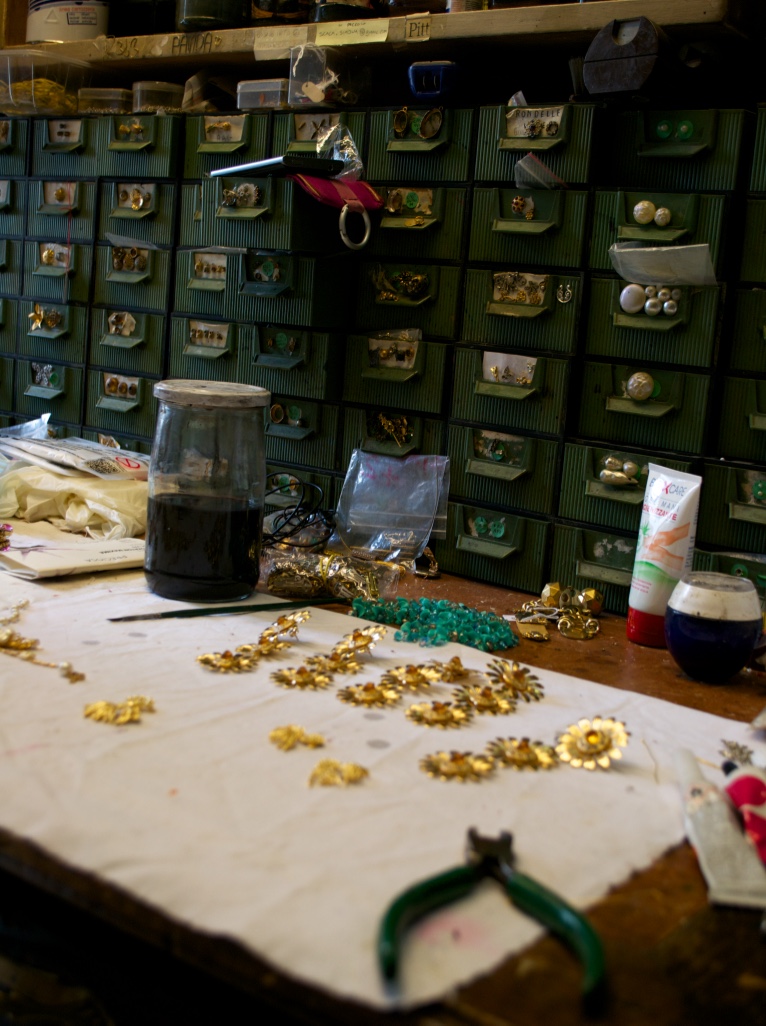 Nel vasto atelier milanese ci sono contenitori con perline, jais, strass, cristalli e tutto quello che riguarda la fabbricazione dei bijoux, fili e ...