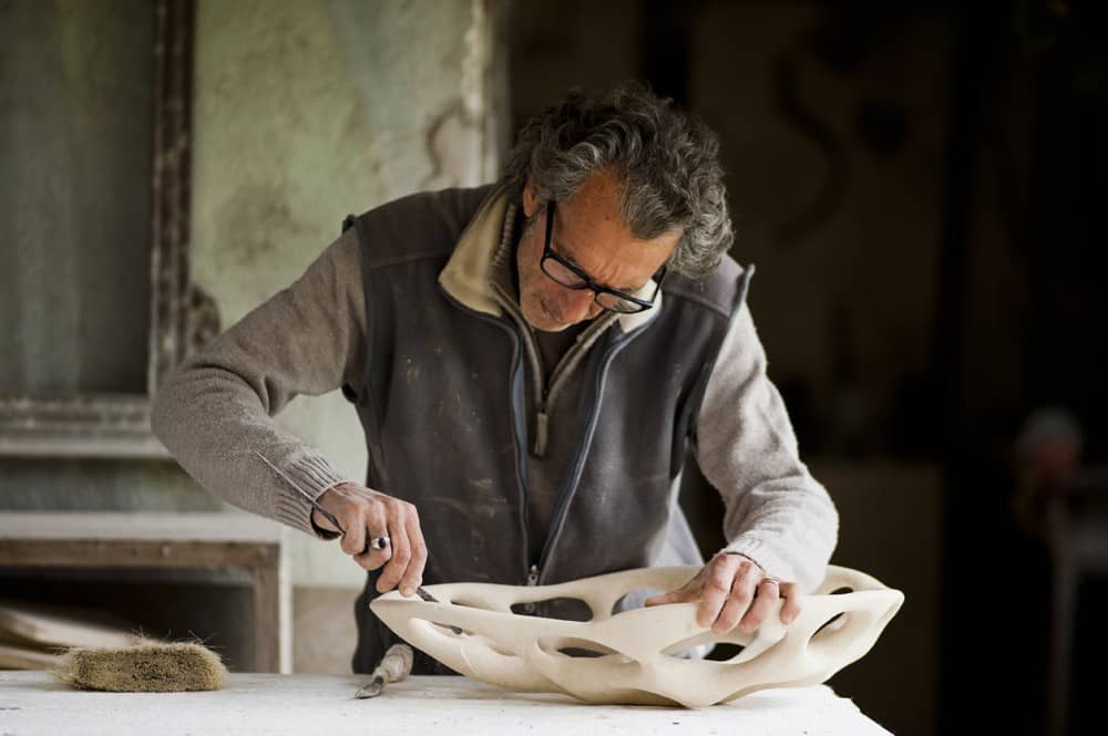 La pietra leccese è un materiale dalle caratteristiche estetiche sorprendenti e dalla facile lavorabilità, elemento peculiare dell’architettura barocca leccese. Renzo Buttazzo è uno dei migliori interpreti di questo straordinario materiale. Attraverso una lunga attività di ricerca e sperimentazione, è riuscito a creare uno stile unico e inconfondibile, combinando la sua abilità artigiana con un forte spirito innovativo. Nelle sue opere di design e scultura le qualità della pietra vengono esaltate donando alle forme un senso di leggerezza e morbidezza. Le sue creazioni possono essere su misura o riproducibili, anche in scala, in modo da adattarsi a ogni ambiente domestico.
