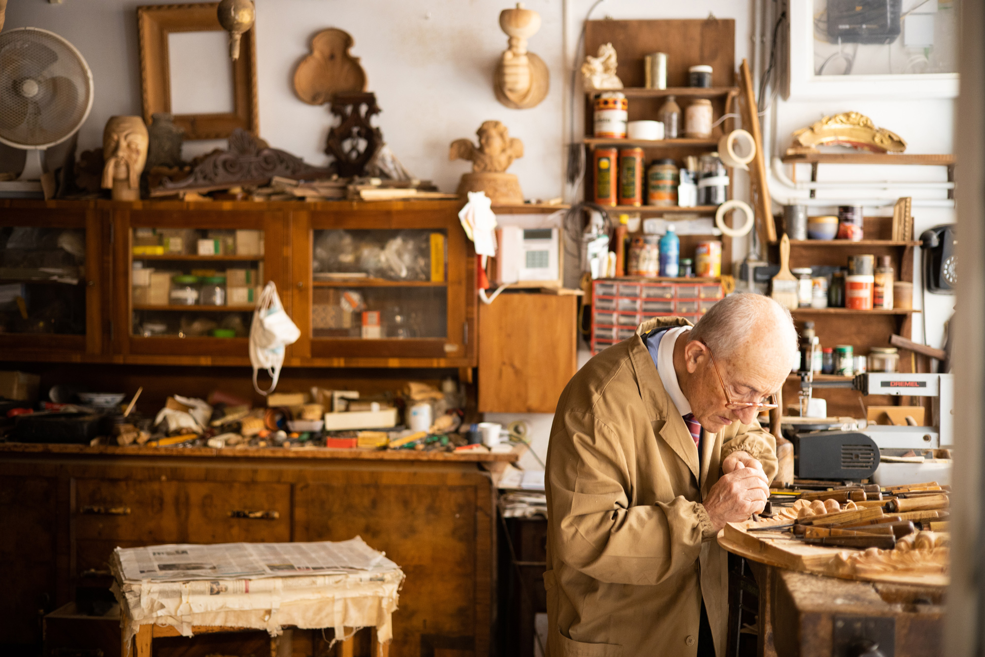 For over fifty years, he has been manufacturing candleholders, frames, plates, putti, sculptures and all kinds of furniture and is one of the few artisans still sculpting the famous Venetian “moretti”, (figurines of Moors) that made him famous. As a skilled wood carver, he creates one-of-a-kind pieces on demand or according to the client’s design as well as copies and reproductions of ancient works.