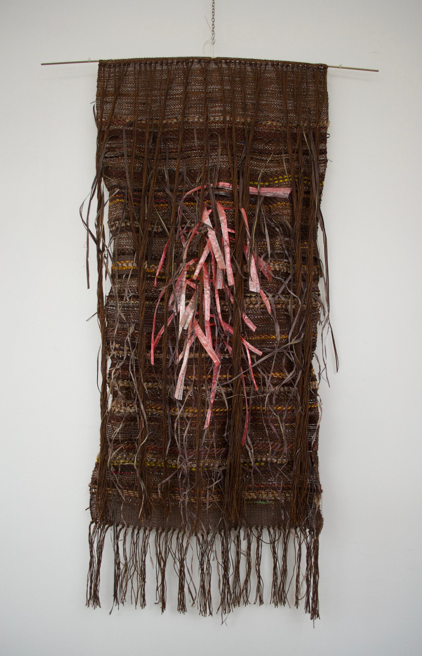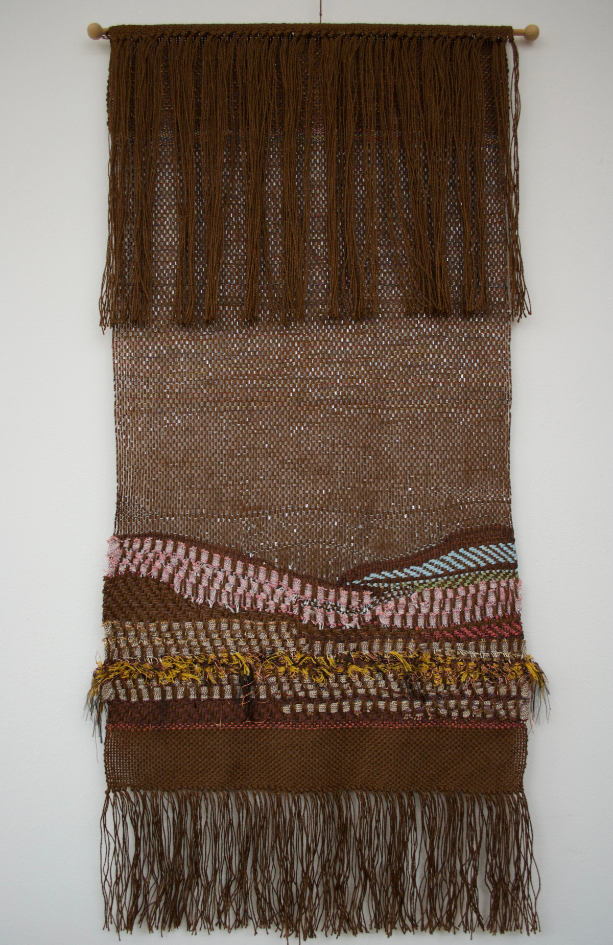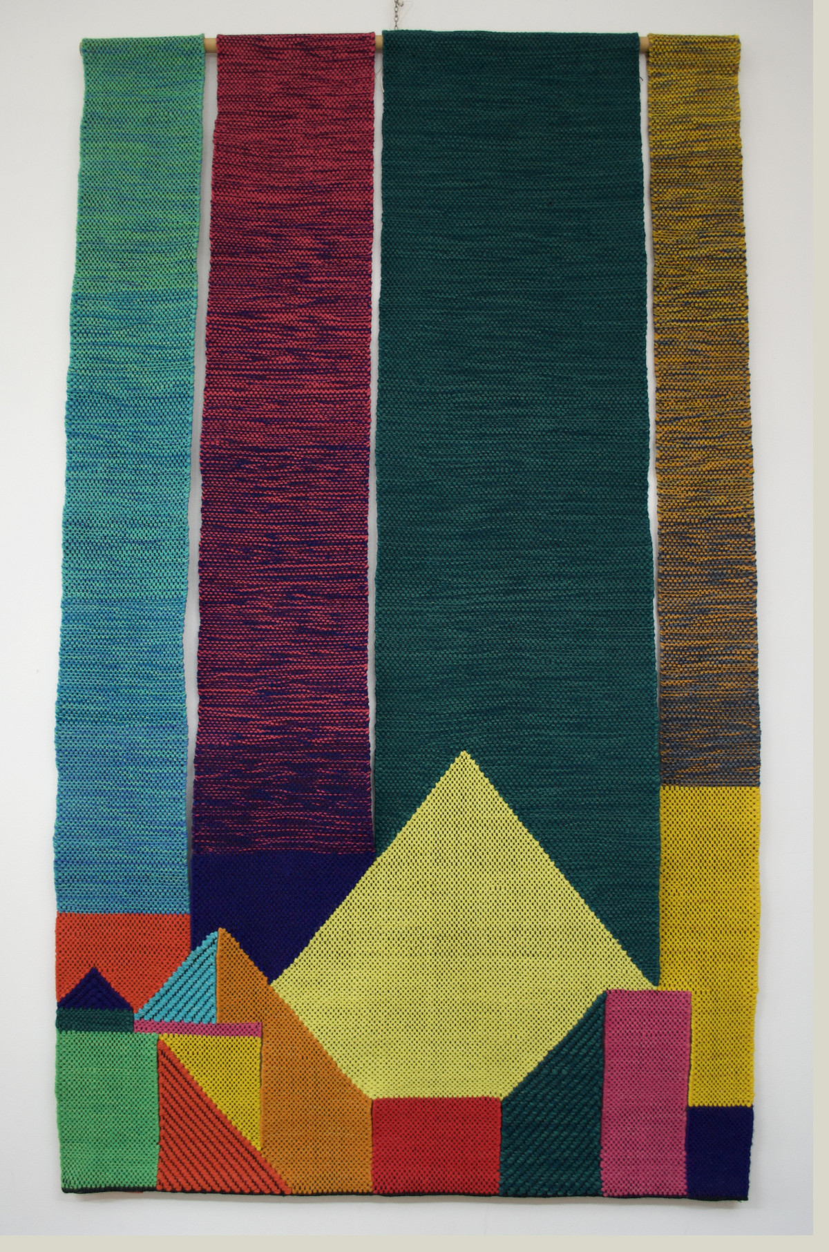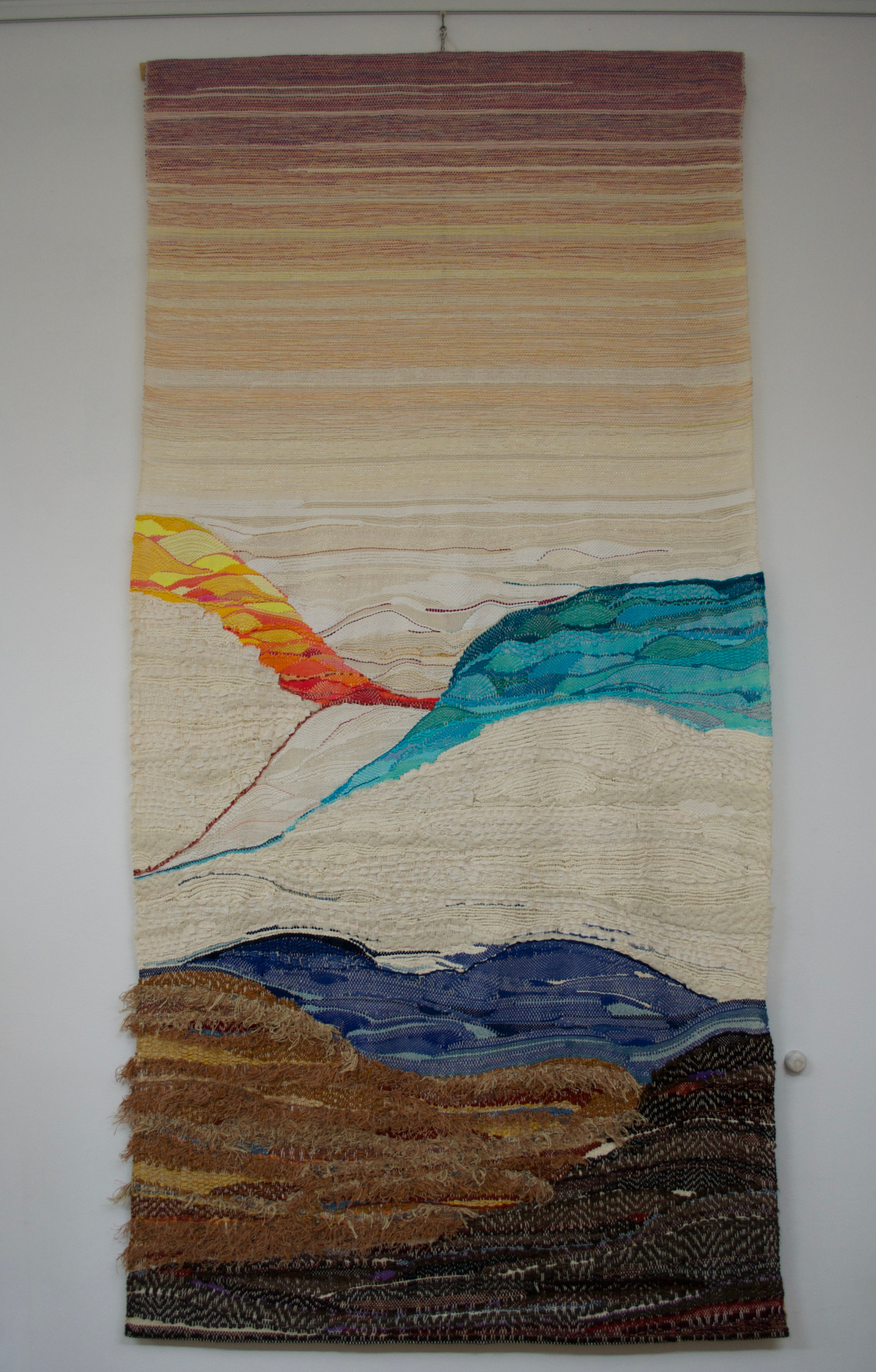 Cristina is first and foremost a great artist: it would be reductive to define her tapestries as woven as they are chromatic compositions, musical symphonies, and tactile emotions. Touching them with the fingertips, one can feel the different materials that have been used, the interlock of the warp and weft. One can almost perceive the coloured strands like a message in Braille, and then when seen with the eyes, reality is more than expected and we are transported into these surreal landscapes. Cristina is a reserved and gentle soul; she expresses her charisma through her loom and the most unexpected materials that come into her hands. Through her mastery, anything can become art.
