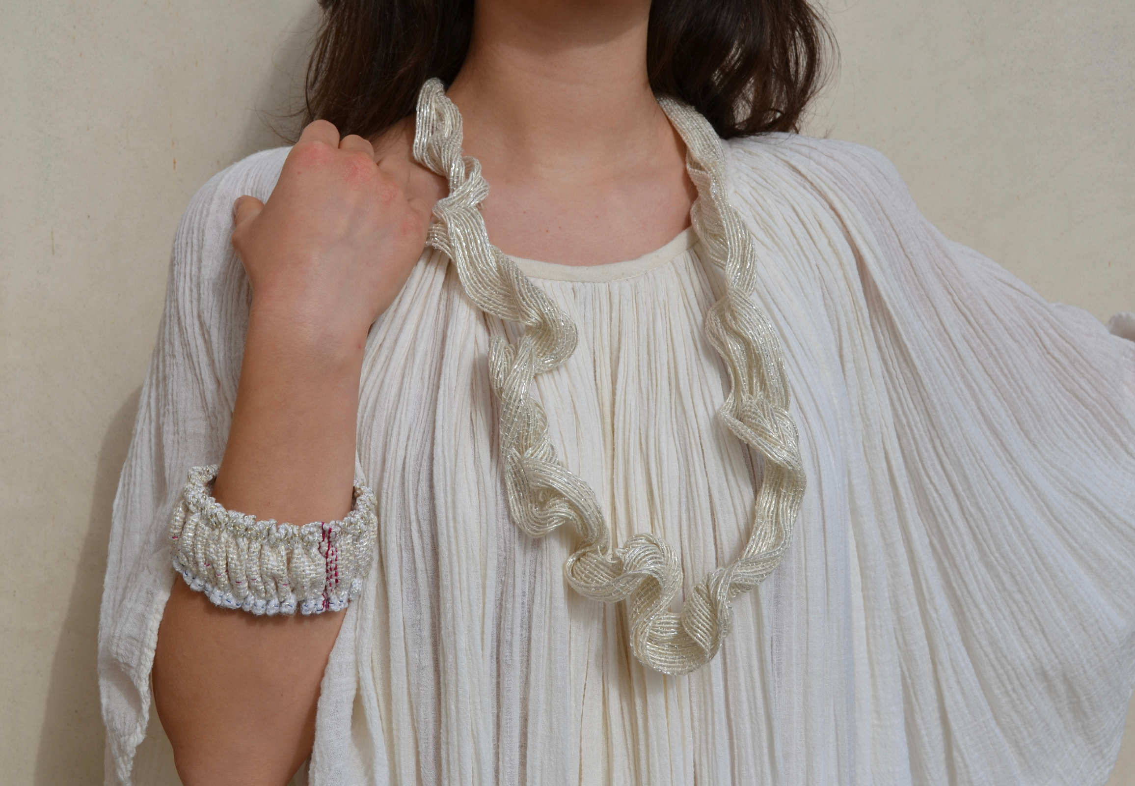 With a diploma in Industrial Design from the Scuola Politecnica of Design of Milan, Cristina Busnelli began her activity as a weaver, initially making tapestries, designed to be reproduced in several copies, and decorated with geometric patterns: her research into three-dimensional production, at first with a uniquely “optical” nature, then becomes material. Cristina started to experiment with combining different materials and techniques; curved weaves, materials of different thicknesses, entwined motifs and smocking, enriching the experience, which from visual also became tactile. The craftswoman then extended her production to costume jewellery, clothing accessories and objects for homes and for churches. Each piece is unique, woven on a handloom and the result of a process of which Cristina follows every phase of production, starting from the choice of materials.