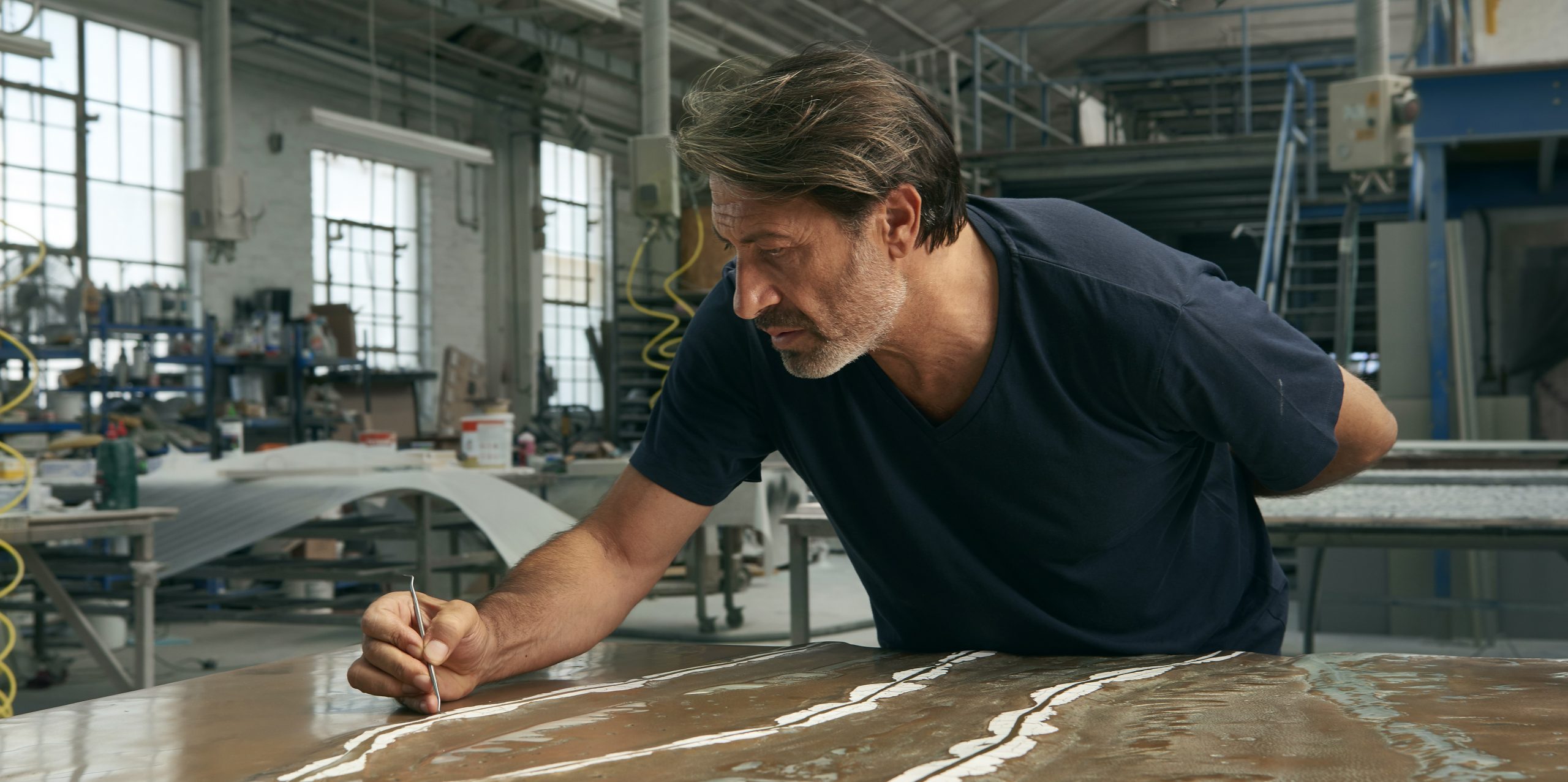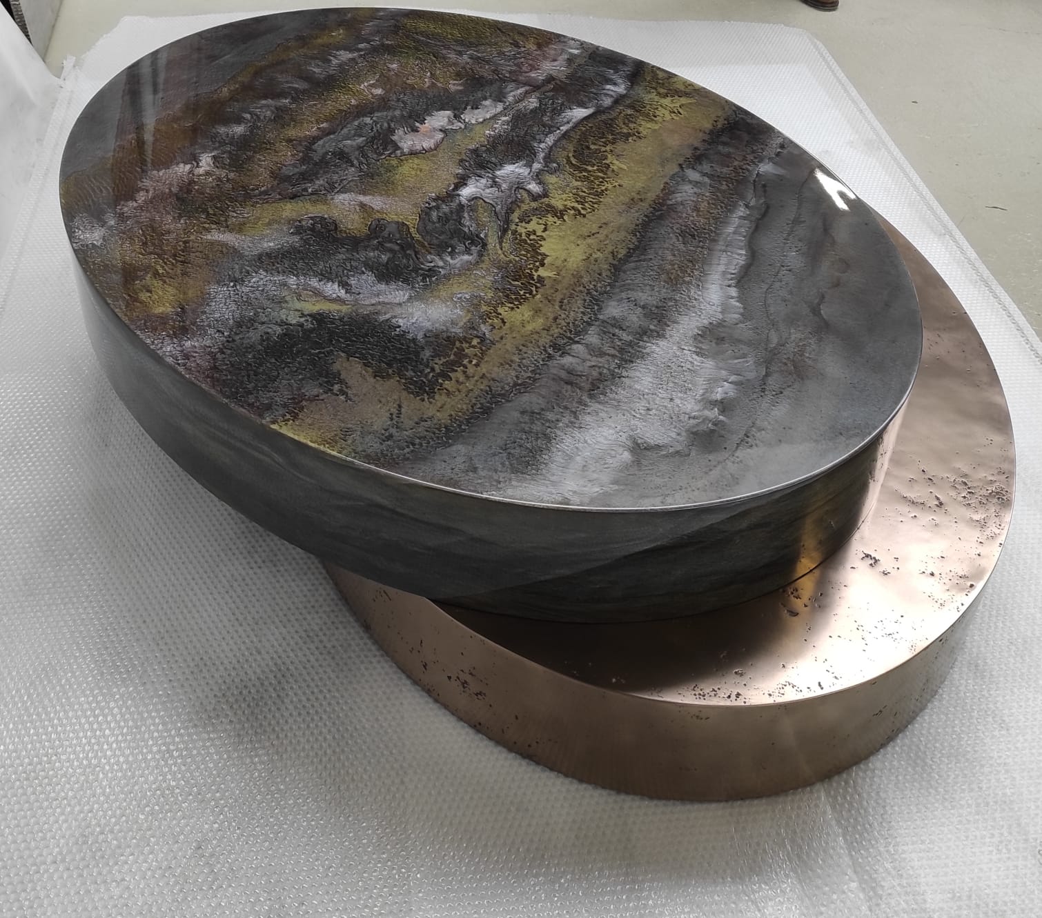Donato Coppola was born in Bernalda, close to Matera, in 1964. Driven by ambition and curiosity, at a very young age he left his hometown and moved to London. Here, he took his first steps in the interior design field, first working in Mauro Perucchetti’s studio and later opening his own atelier: Officina Coppola Ltd. The studio introduced innovative techniques in applied arts, pioneering the use of liquid metal, lime stone and resin to create furniture, artworks and installations.