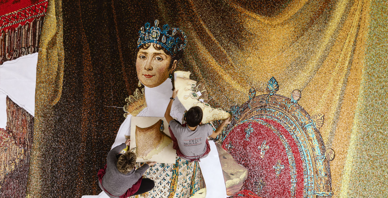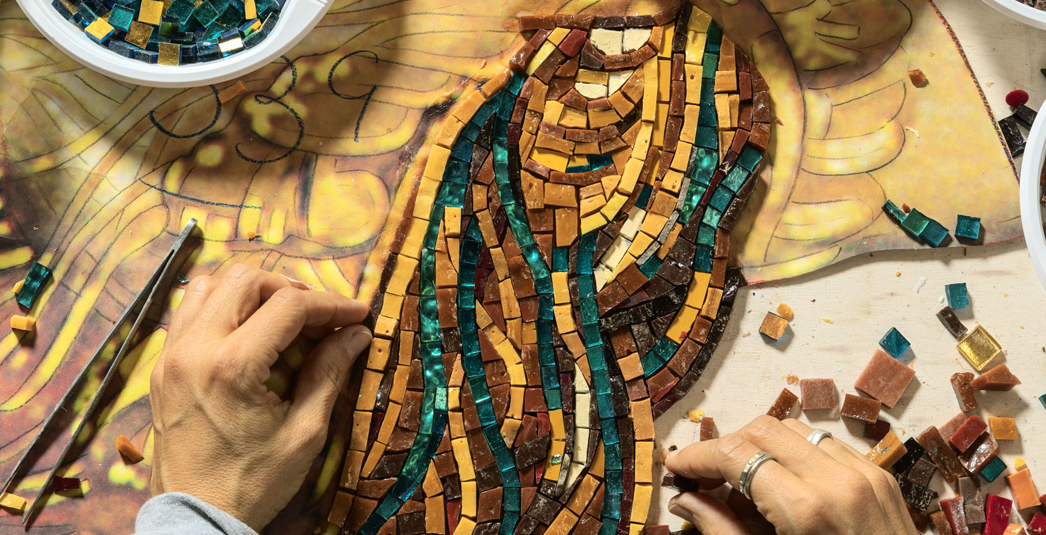 Friul Mosaic is an artistic mosaic workshop in San Martino Al Tagliamento, near Pordenone. A craft business with a long tradition, but with an open mind towards contemporaneity: starting with the design, always searching for innovative patterns and original compositions, each mosaic is hand-crafted, tile by tile, abiding by the traditional techniques of classical mosaic. Today the atelier is run by founder William Bertoia, Natalina Querin and her two daughters Barbara and Tiziana, and they exclusively employ master craftsmen trained at the Scuola Mosaicisti del Friuli (Friuli’s School of Mosaic), located in Spilimbergo. Wall mosaic decorations, floor tiling, artistic and architectural solutions are all strictly made-to-measure, with mastery, rigour and sartorial precision, never forgetting creativity and innovation. In fact, alongside classical motifs they also experiment with original and modern textures, inspired by nature, artworks and mythology, but also by the concept of modern mosaic as an interior design element.