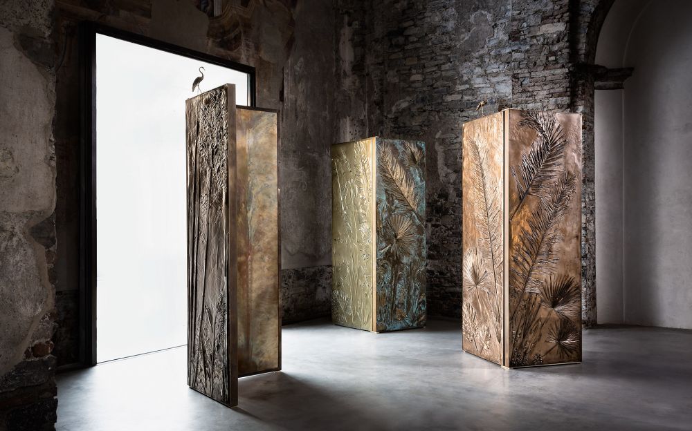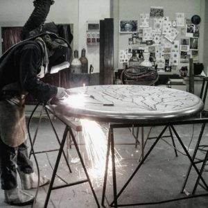 In his laboratory he works with many different metals: iron, stainless steel, bronze, aluminium and glosses; experimenting and featuring highly innovative melting processes, forging techniques and decorations. His house is a showroom, full of self-made and visually impacting furnishings.