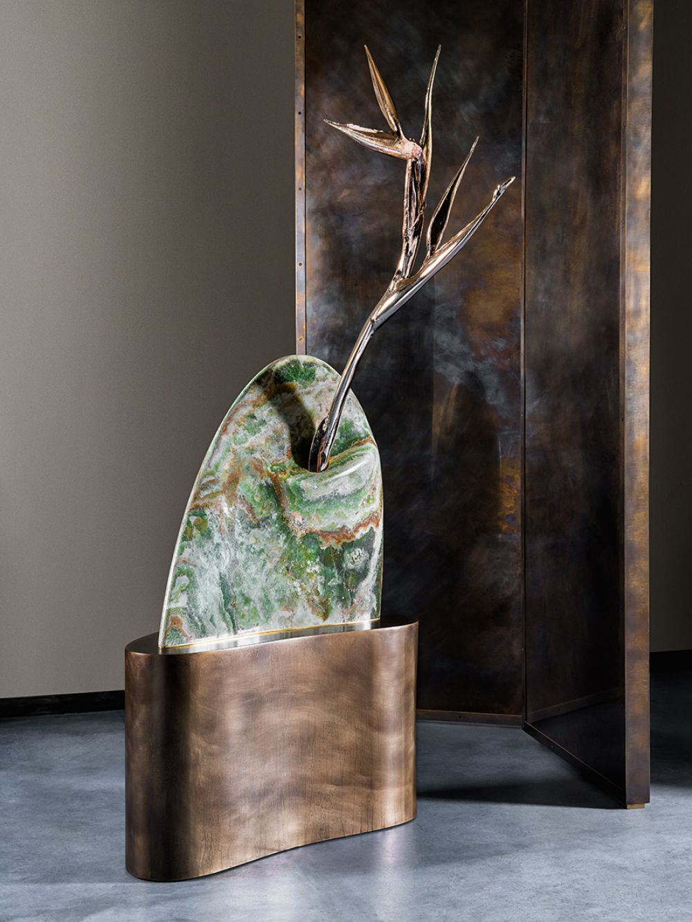 In 1997, he decided to return to Milan: he was attracted by the flexibility and flair of Italian craftspeople. Pacchioni opened his studio in a factory from the 30s, and years of great creativity followed. International partnerships abounded and his works travelled the world over: his pieces were purchased by private collectors, and also installed in parks, gardens and luxury hotels. One particularly satisfying achievement occurred in 2014, when the Italian embassy in France chose one of his pieces — a monumental sculpture in stainless steel, which is permanently exhibited in the Paris embassy’s hall of honour — to represent the excellence of italian craftsmanship.