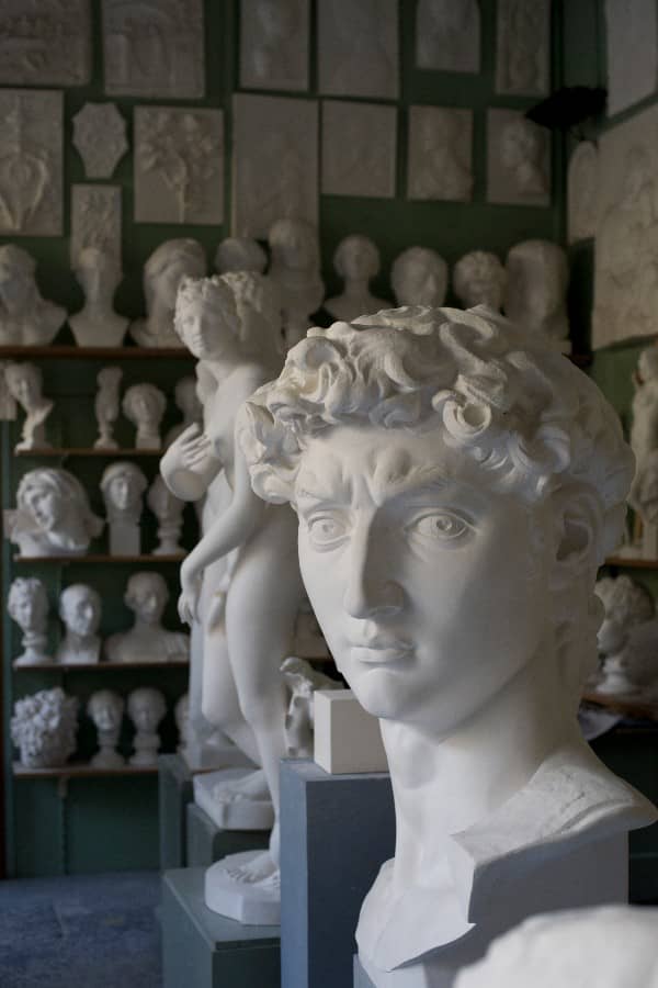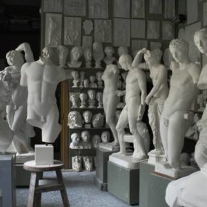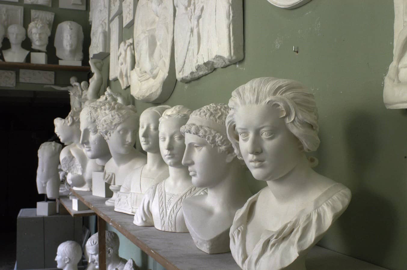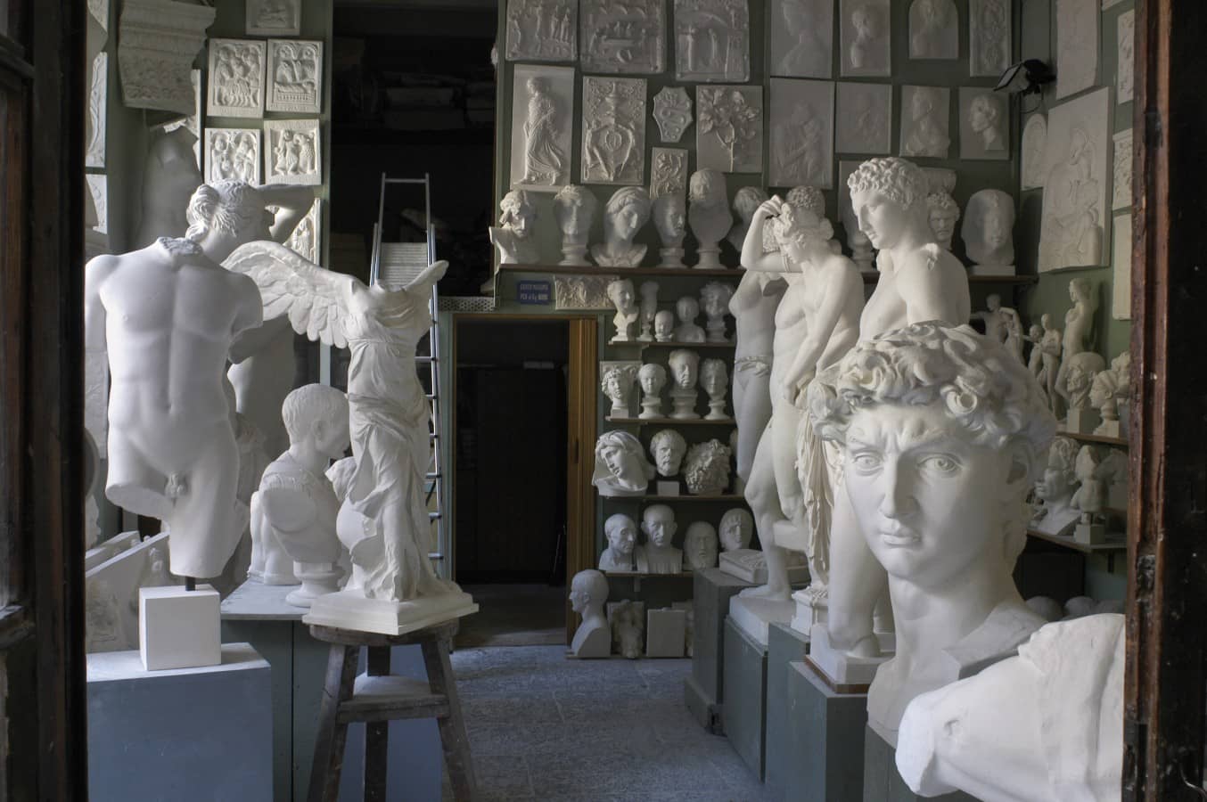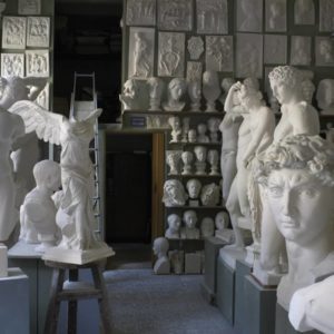 A magic atmosphere, suspended in time and space: that is what awaits you when you enter the Gipsoteca Fumagalli and Dossi, where wonderful plaster casts, ranging from ancient Greek art to the 19th century, are being created; an atmosphere enhanced by the collusive fine dust from chalk-working and the patinas developed by Mario Dossi and Roberto Fumagalli. Canova’s heads, the horses from the Parthenon’s frieze and Michelangelo’s David are just sensational