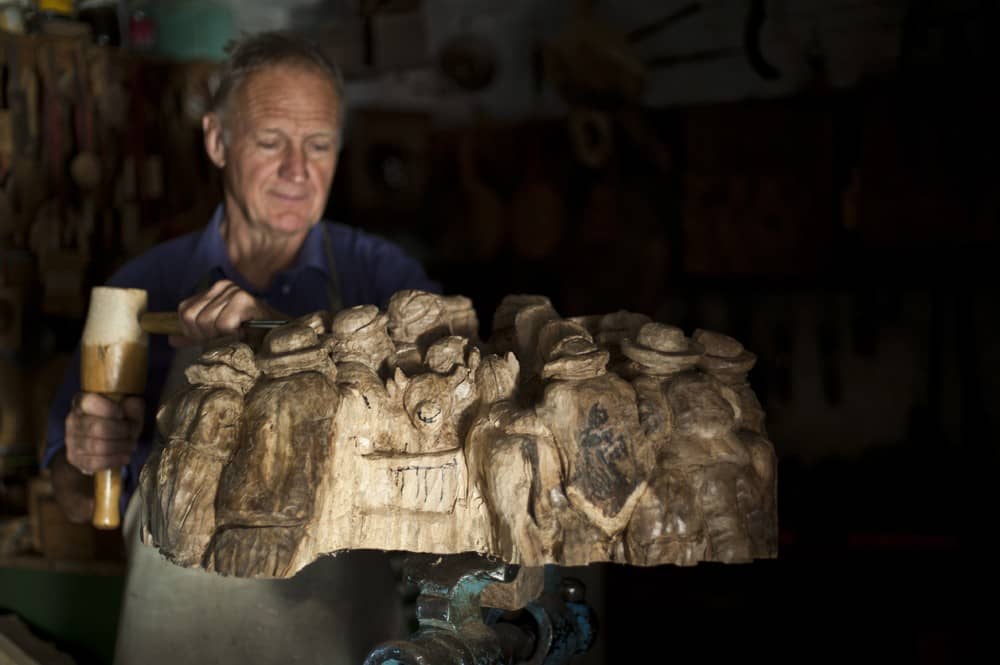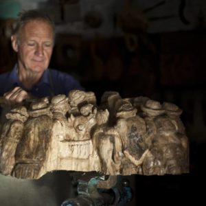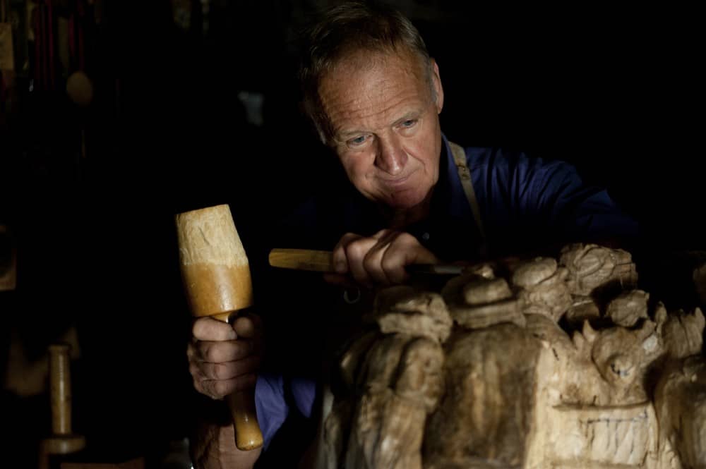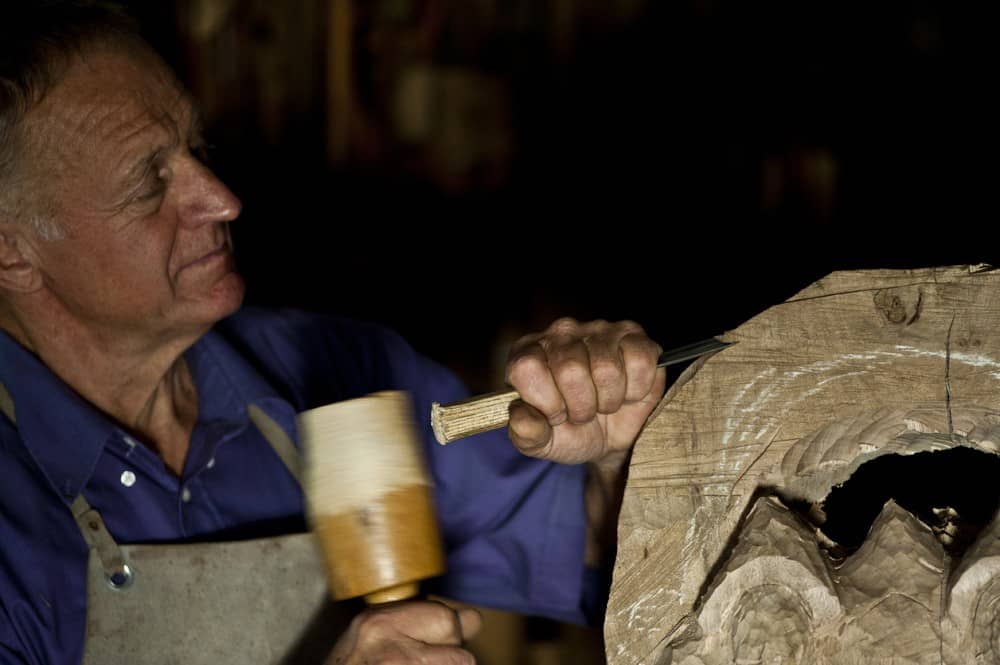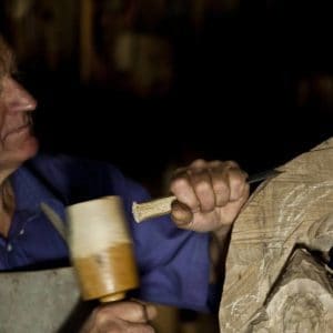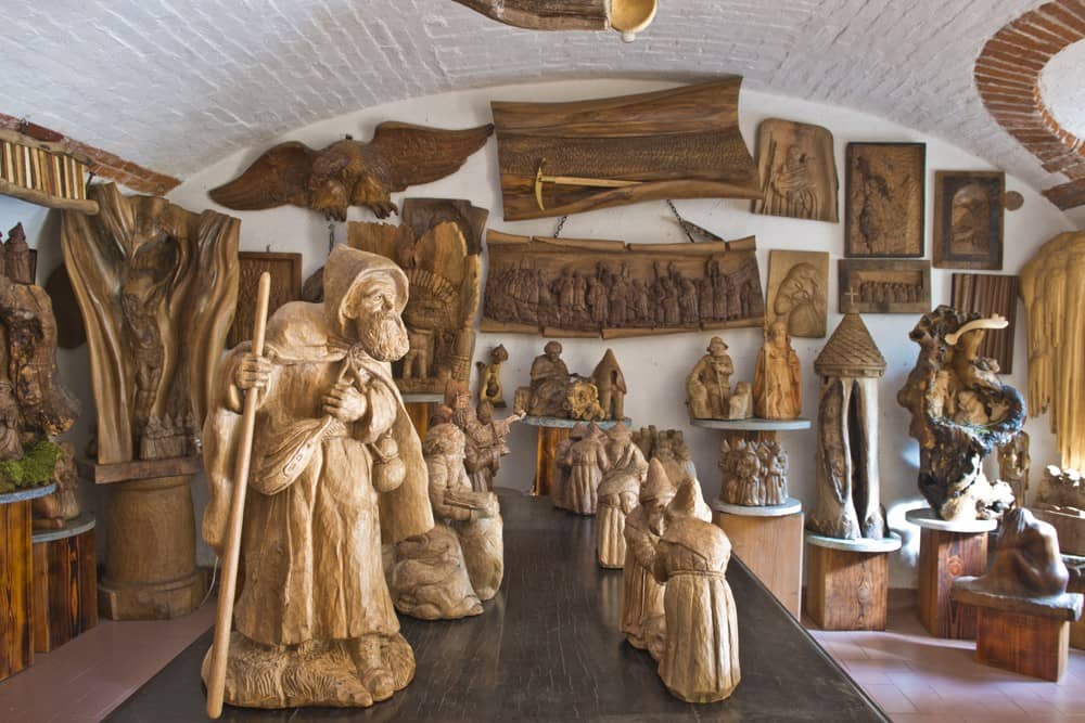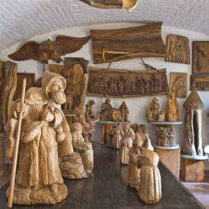 Guglielmo Pramotton is one of the major representatives of traditional craftsmanship in Val d’Aosta. His workshop is a magic place, where wooden sculptures come to life. They are animated by powerful expressions, and are cabaple of arousing emotions and of telling stories about local traditions. The sculptures of monks, hard-working winegrowers, sheep and shepherd represent scenes from the everyday life of the past, immersed in the mystical environment of the mountains. With his chisel, Guglielmo is able to extrapolate the communicative potential from the wood, enhancing each veining and nuance.