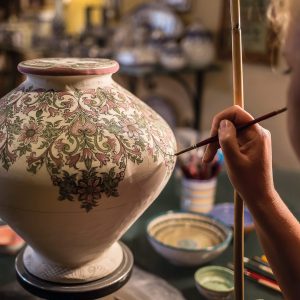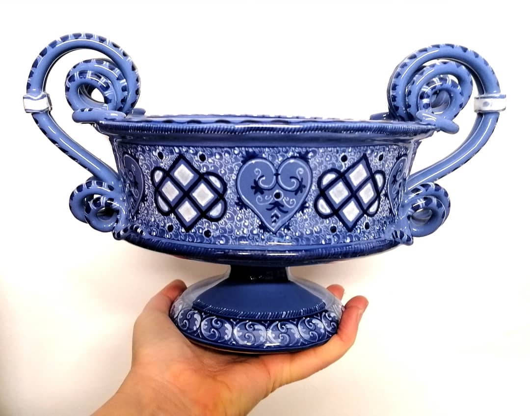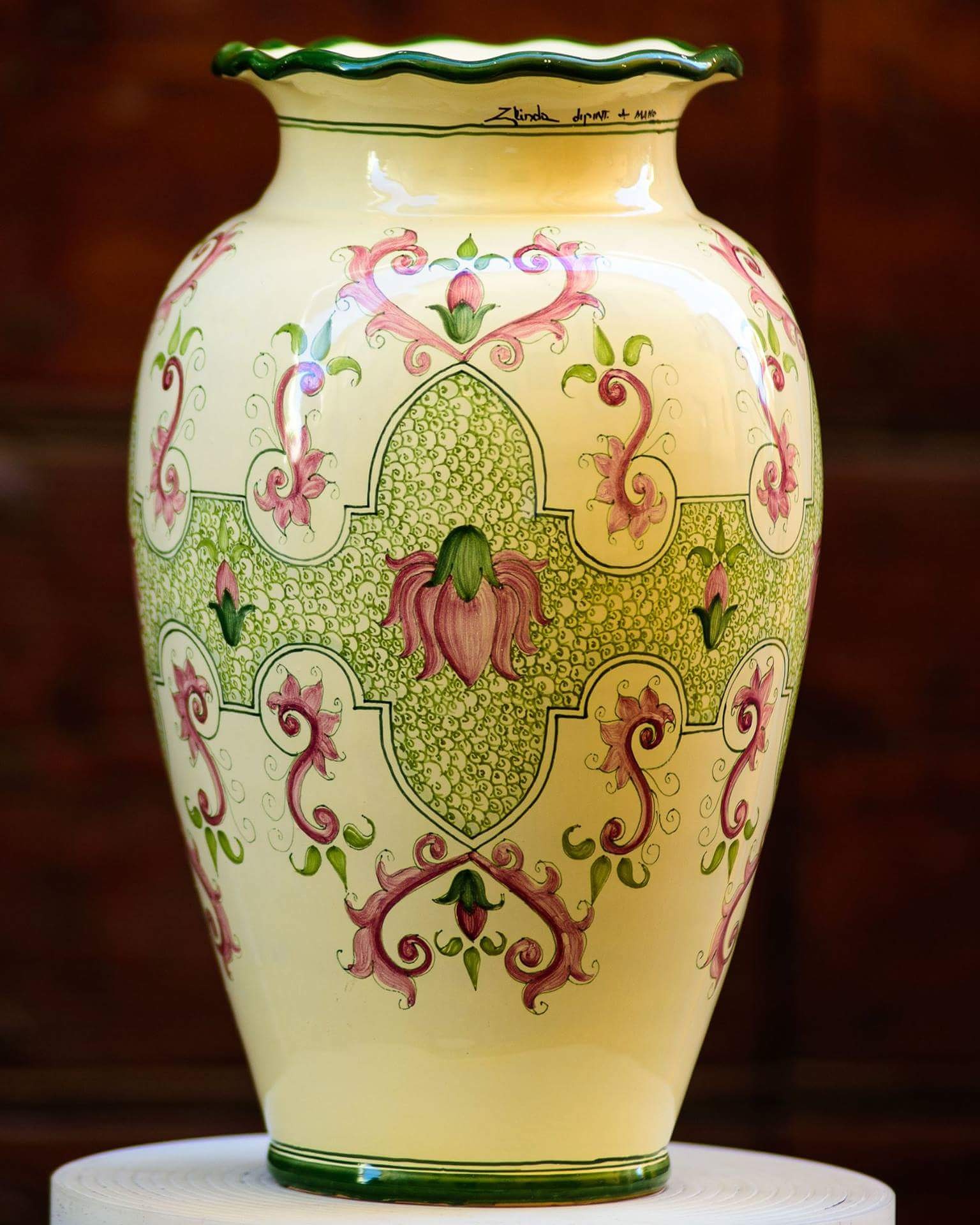 Today, in her studio, Linda holds classes and workshops and creates unique sculptures and furnishings: her ceramics stand out for the refined and elegant decorations, in which she combines classic style with more modern, fine and geometrical pictorial patterns and tone-on-tone colors. On commission, she can execute any style, decoration and customization, collaborating with other craftsmen in order to fulfill specific requests such as tables, mirror frames and other furnishings.
