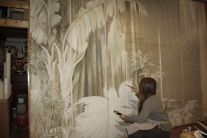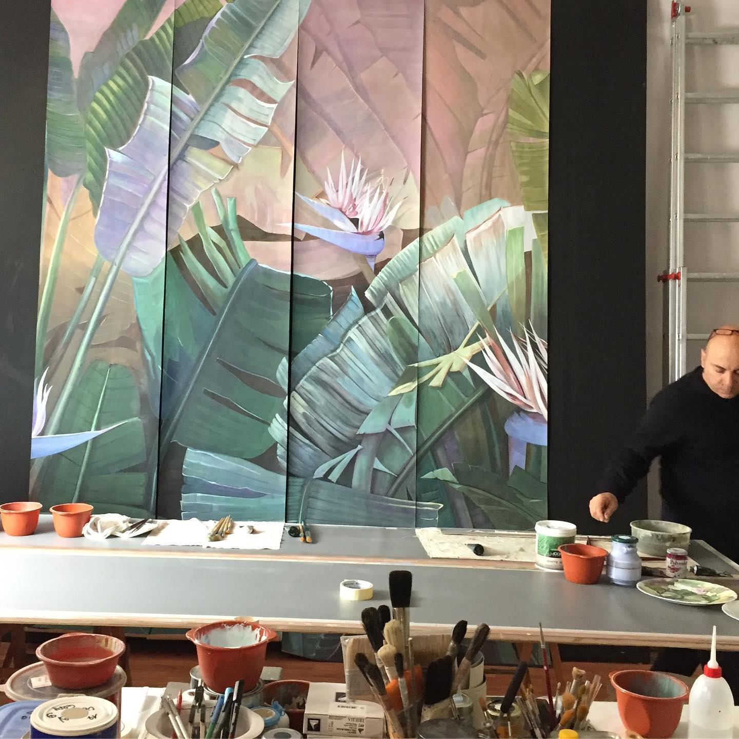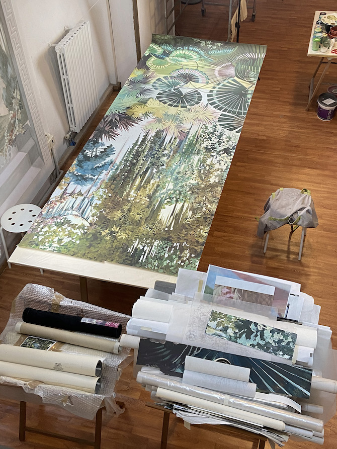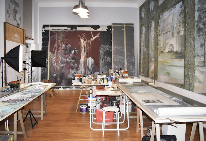 In their Larghevedute studio in Milan, they design customised scenographic settings, which are later applied to walls, ceilings, doors or furniture. Each stage of workmanship is strictly handmade, with ancient decoration techniques used on wallpapers, fabrics and natural cotton canvas.