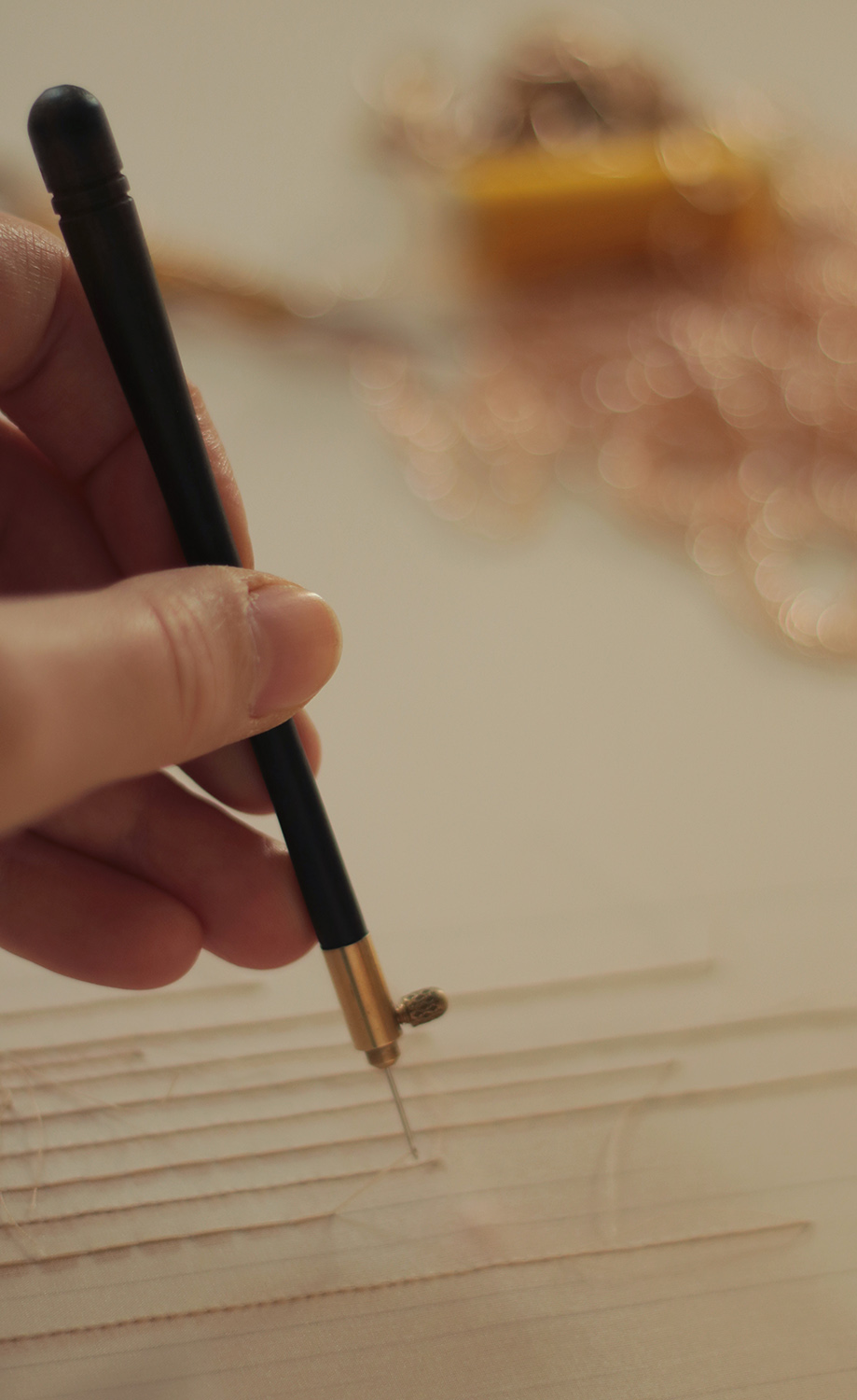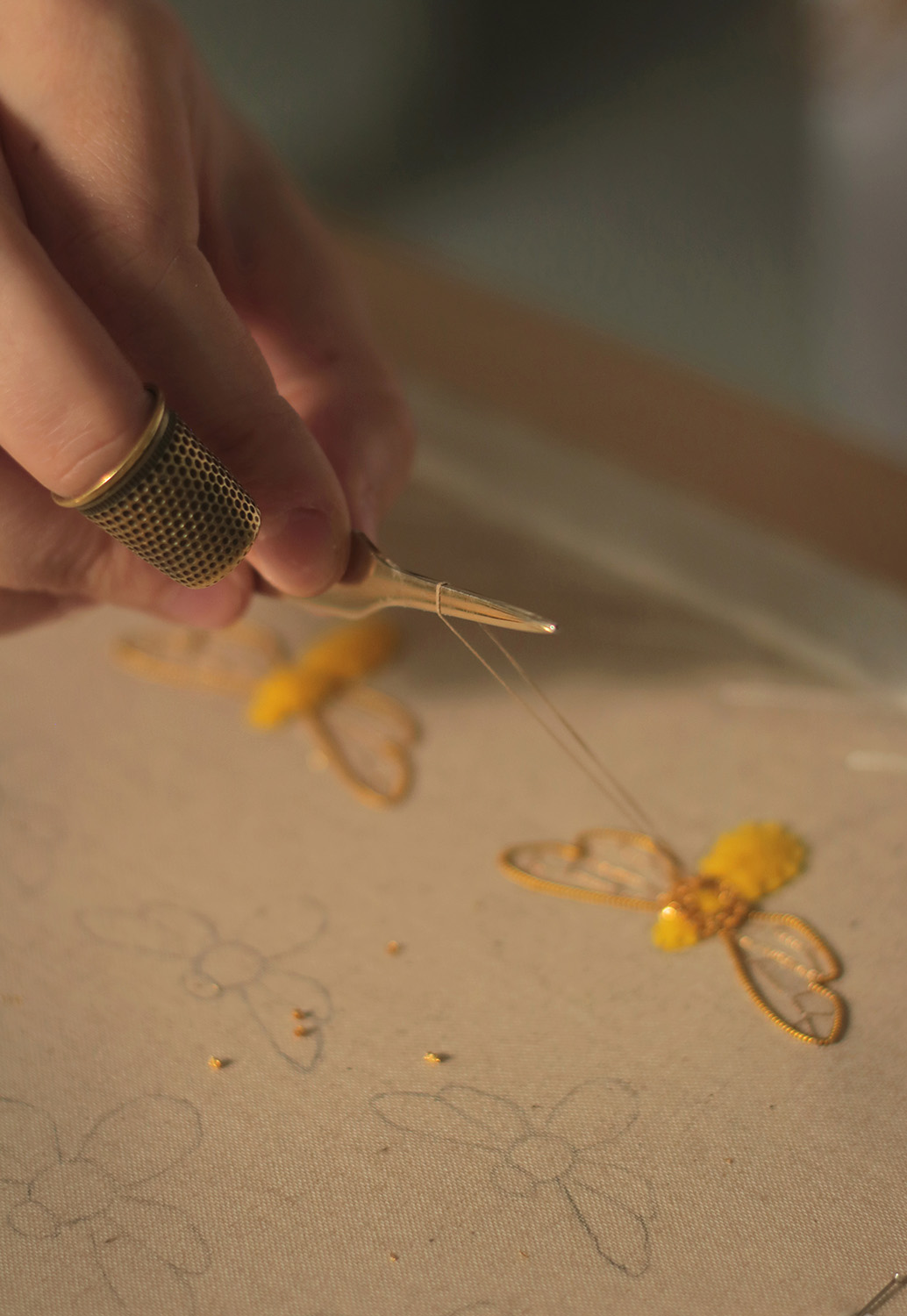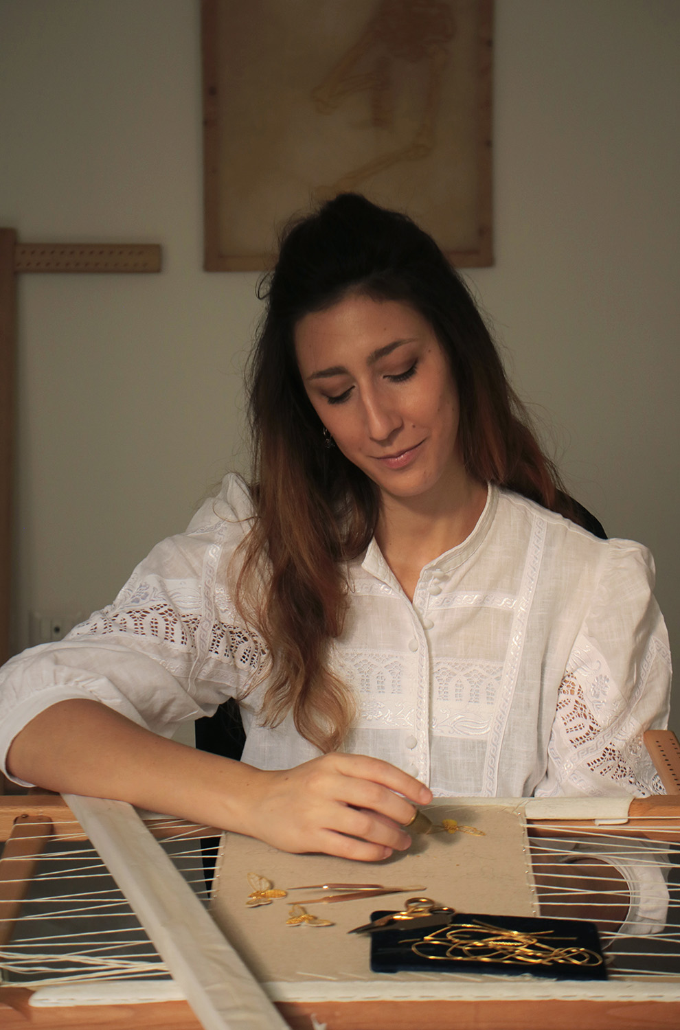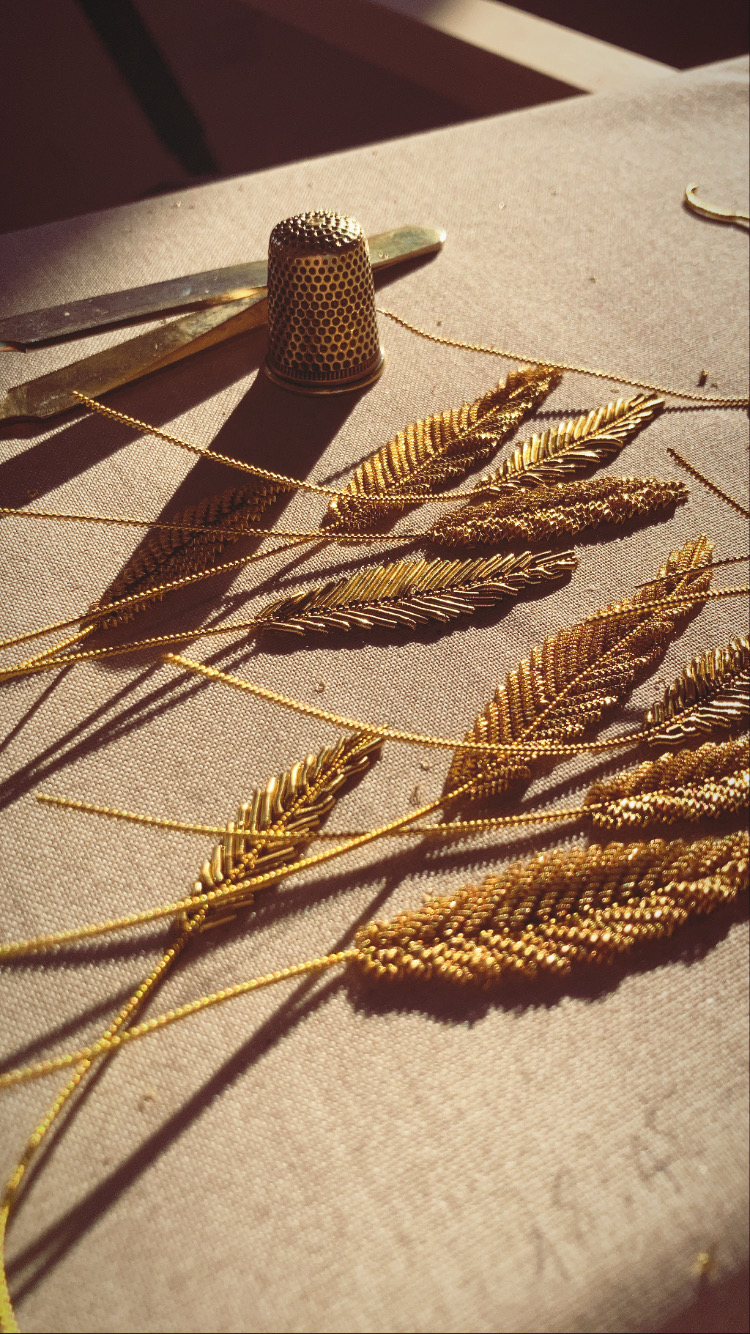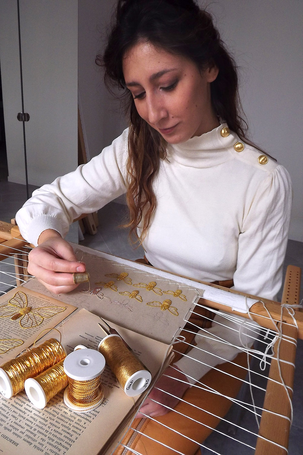Her brand Aembrosia Luxury Embroidery specializes in crafting hand embroidered accessories, by implementing antique and exquisite techniques: her bijoux, brooches, wedding ornaments and much more, all inspired by natural elements, are designed and entirely handmade in her workshop in Monza. Maria Francesca studied thoroughly the historical techniques of embroidery, which she now presents in her own personal, poetic and contemporary style. For her, embroidery is a way to express her vision and creativity in an innovative and experimental way. She specializes in haute couture and golden embroidery, a technique in which the material is dipped in 24-karat gold, thus turning the accessories into actual pieces of jewelry. She also works on commission, for private clients and other brands.