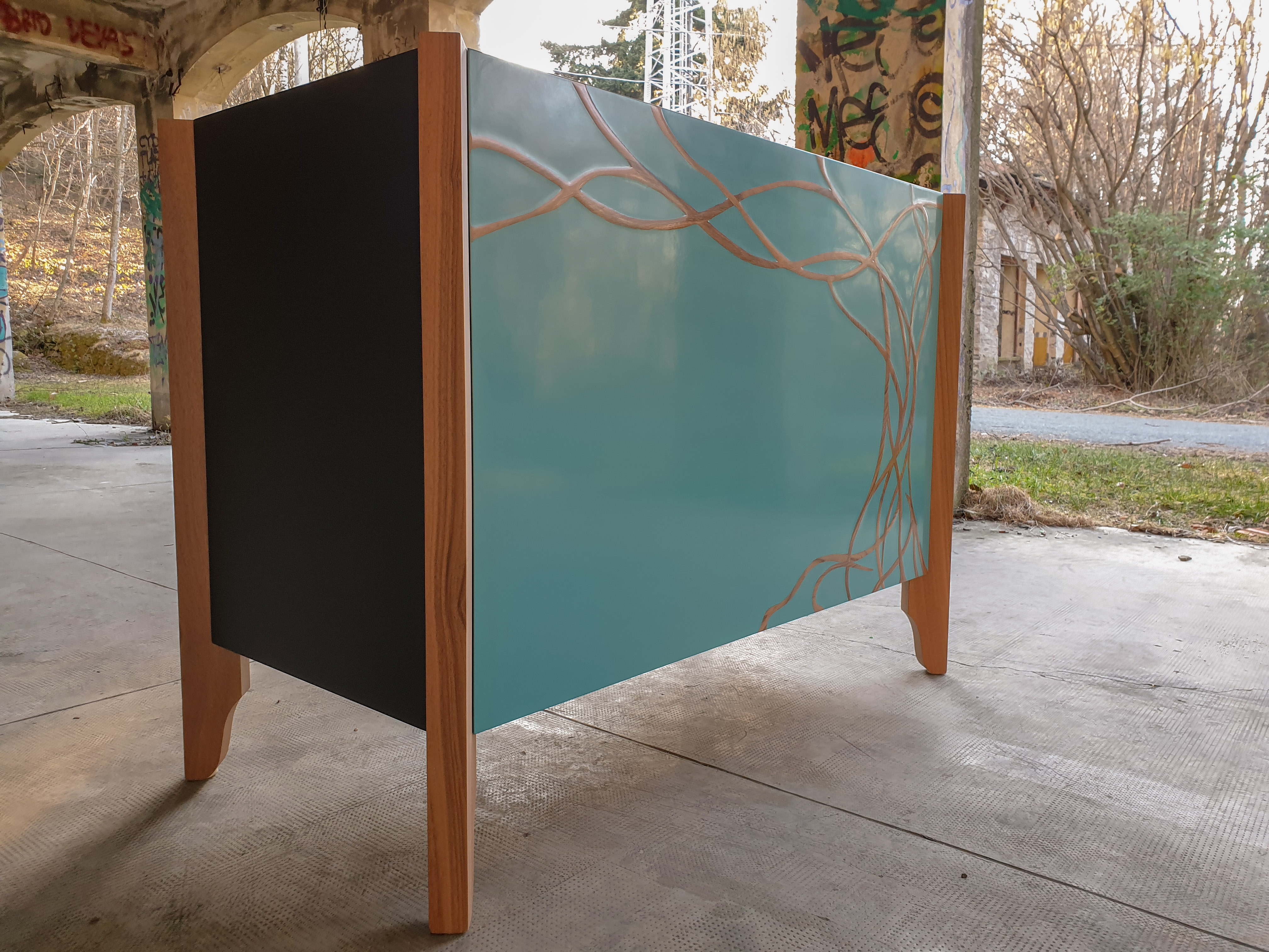 Through manual work and manipulation, Mario explores the infinite possibilities of wood as living matter, while always trying to respect the material in its essence. Though his works have a very distinctive style, he also designs and creates custom furniture, accommodating each client’s needs. Recently he presented the new “Ombra” line, a series of pieces of furniture decorated with a special technique: the chemical reaction of light on previously polished and painted wood surfaces creates a pattern resembling the shadows of tree branches.