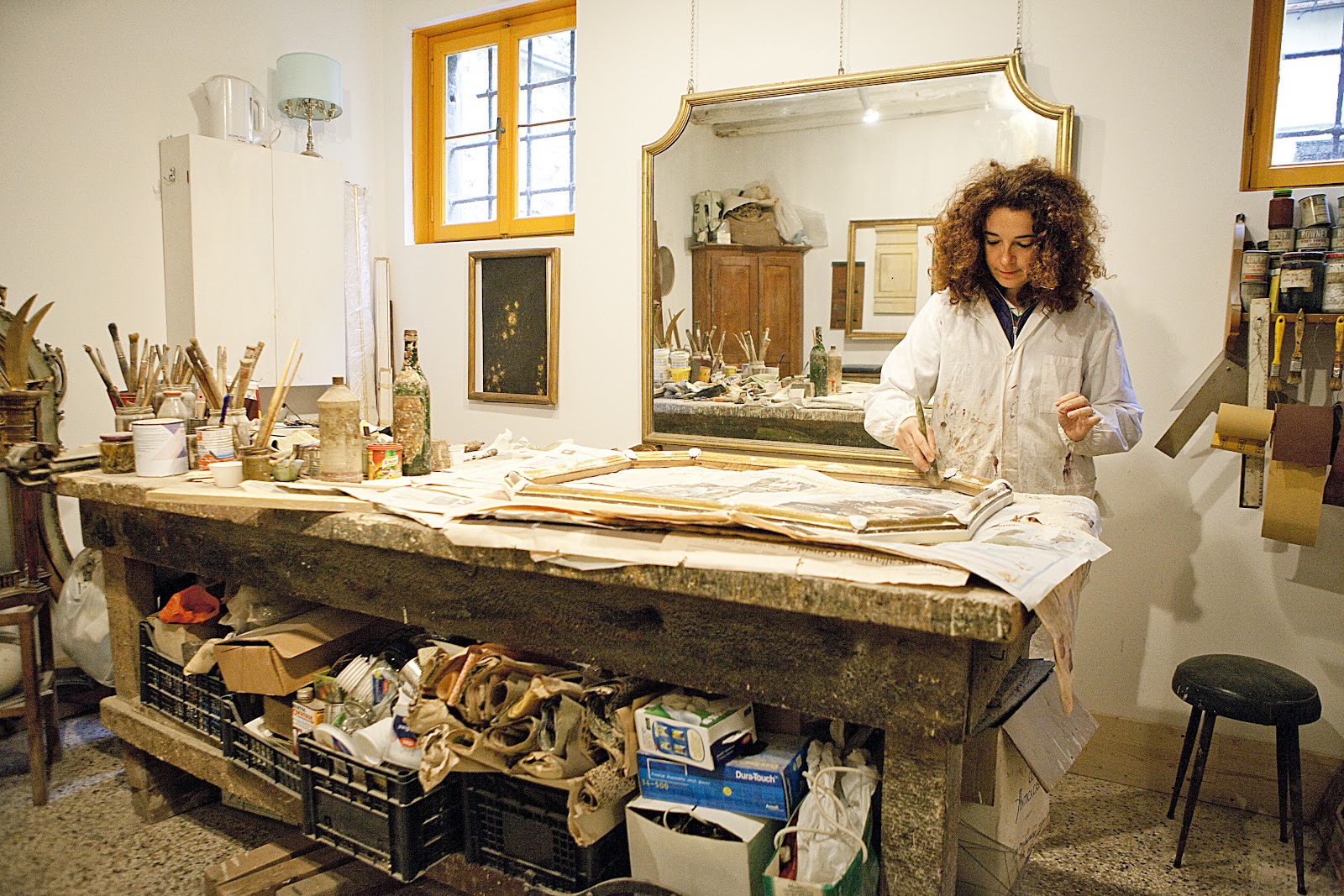 After graduating in Oriental Languages from Ca Foscari in Venice, Elisabetta Mason started her activity as a gilder in 1986, following in the footsteps of her father Luciano, one of the most renowned master gilders in Venice and present in the Laguna since the 1940s. Under his guidance, she was trained in the traditional techniques and ancient processes involved in the art of gilding, thus becoming a keeper of skills held only by a few maestri.