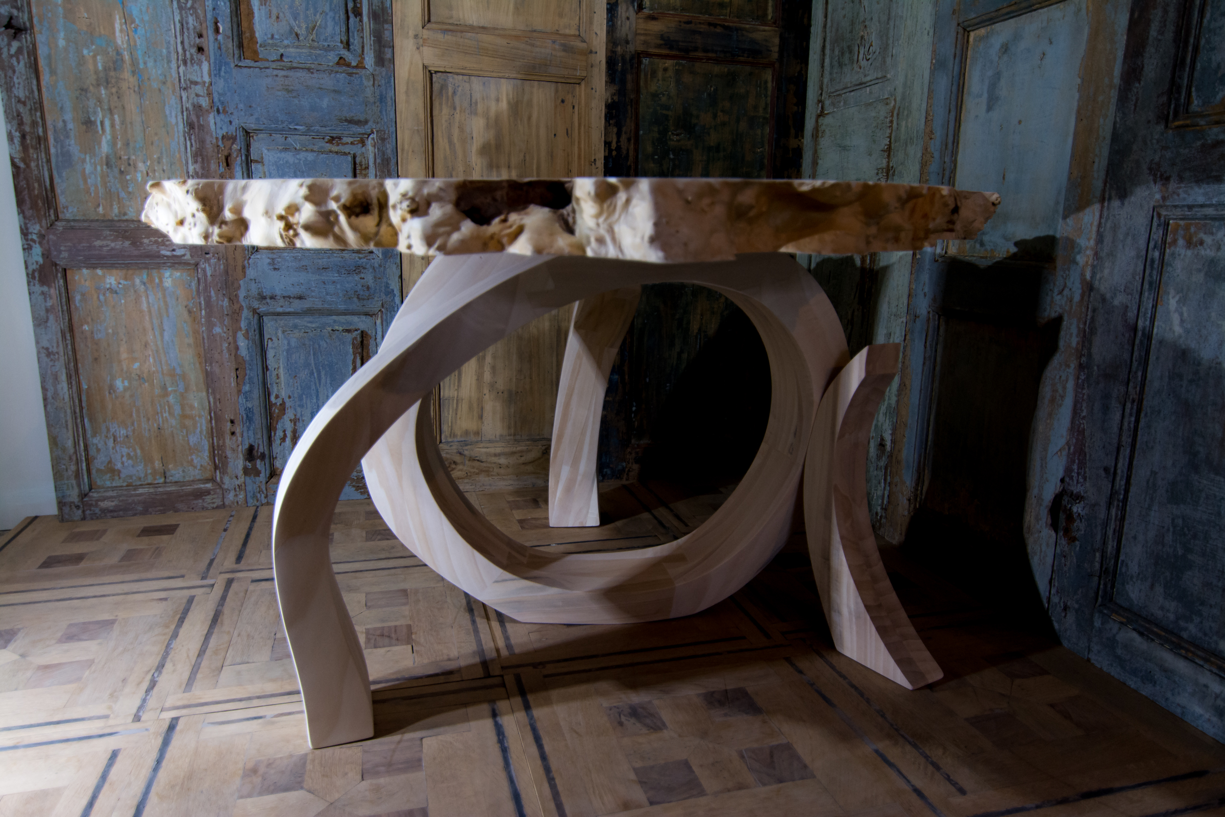 One day, prompted by his playful, ironic spirit, he started designing original furniture, inspired by a world of fantasy: running stools, bowing tables, rolling bedside tables. Hilarious furnishings, featuring a unique style, midway between Baroque and Surrealism, seemingly issuing from Wonderland.