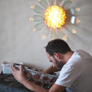Back in his native village, he started creating lamps as if in a wonderful game, by assembling stones, shells, metals and glass shards. Glass, in particular, inspired his creativity, leading him to experiment and explore luminescent effects with a strong visual impact. His lamps, in fact, are not designed to shed light but, rather, to create an atmosphere, by evoking the colours of the sea and the sky, of dawn and sunset, through glass.