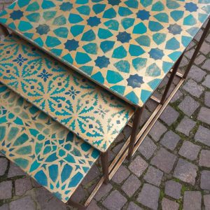They paint trompe-l’oeil frescoes or murals in public premises, shops, homes and child areas, decorate furniture, dye fabrics and restore ceilings. In time, they have specialised in faux-marble and faux-wood reproduction, painted with oil or water techniques.
