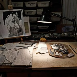 Over the years, the atelier moved to the city center, expanding its production to antique and modern style mosaics, art reproductions, portraits and city views. Today other mosaicists work in the shop, including Renzo’s son, Leonardo: thanks to their extensive technical experience and artistic passion, in the hands of these masters mosaic tiles turn into spectacular compositions, giving life to actual “stone paintings”. The workshop received several prizes and accolades and is now involved in international projects.