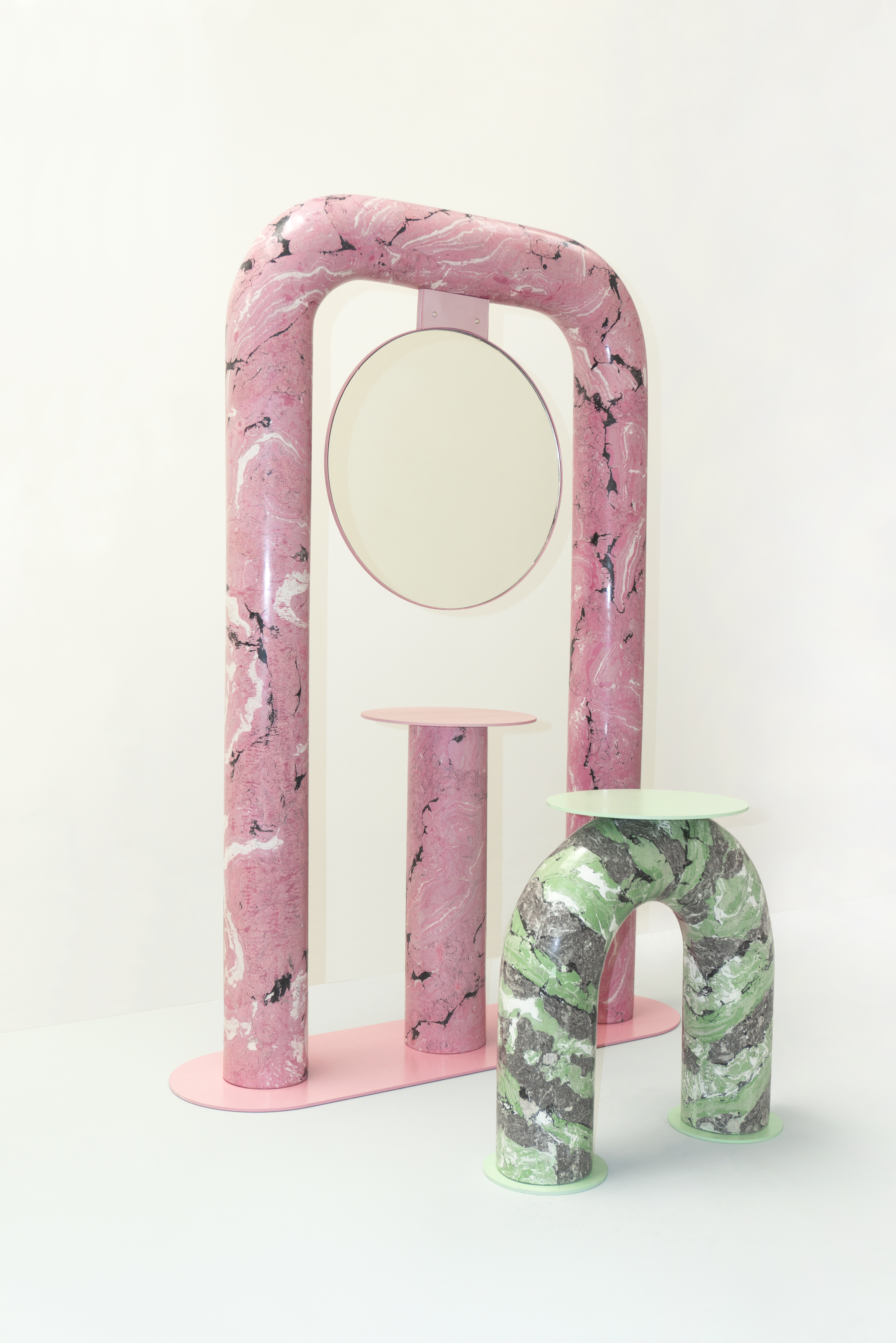 Simone Desirò is a wonderful artisan, who is able to master the difficult art of Rima marble, which is a technique that simulates marble by using chalks and pigments. It is an ancient and hand-working technique, that gives mind-blowing formal results. In his workshop Simone, a man of great purity, creates incredible, sinuous shapes with wonderful chromatic combinations.