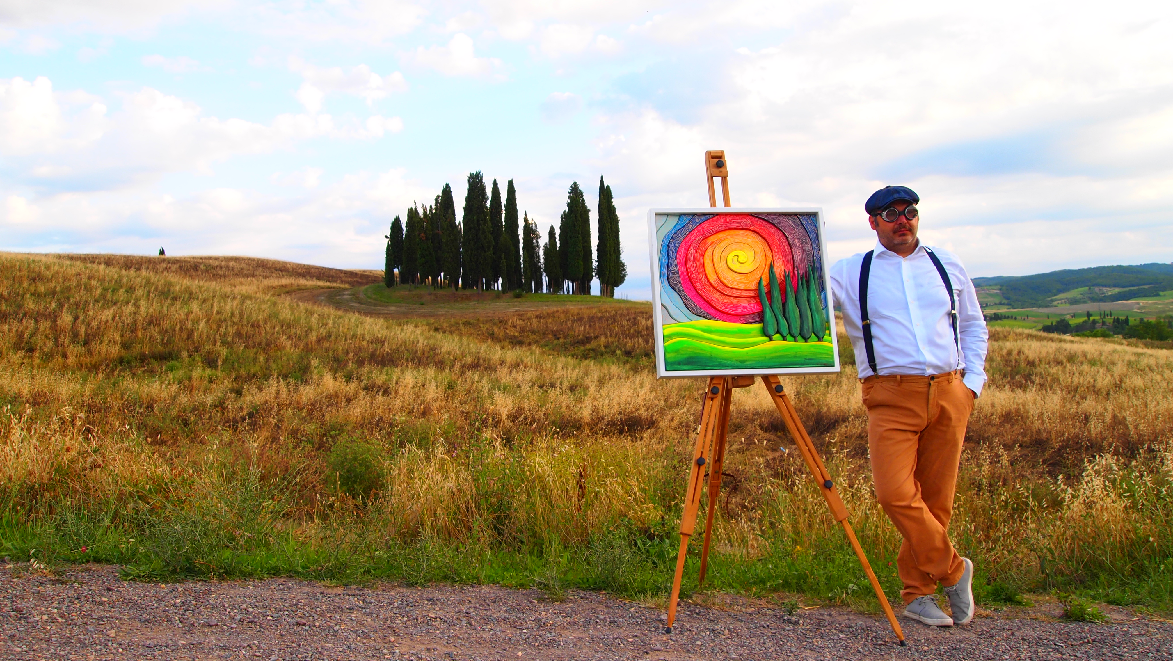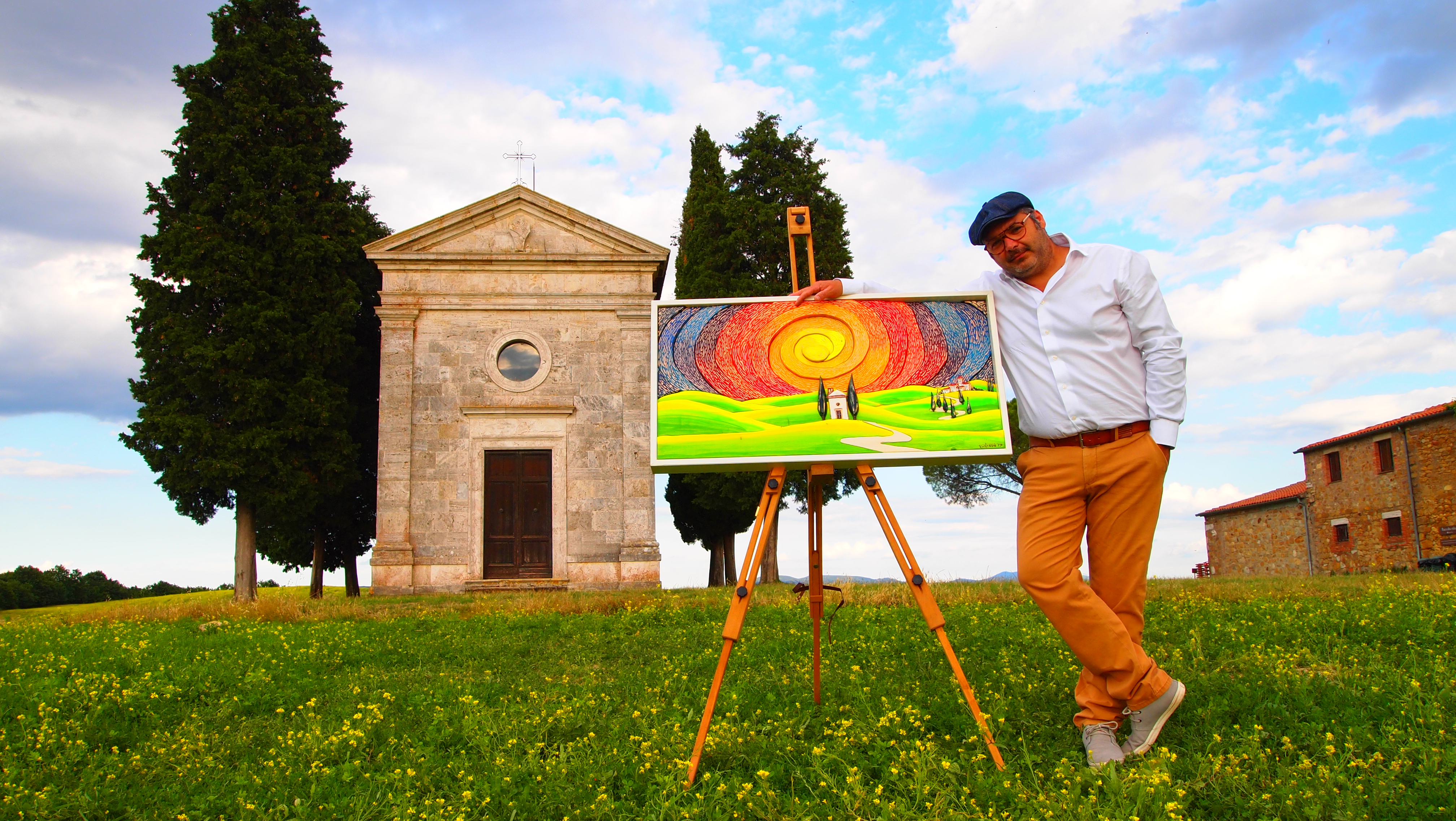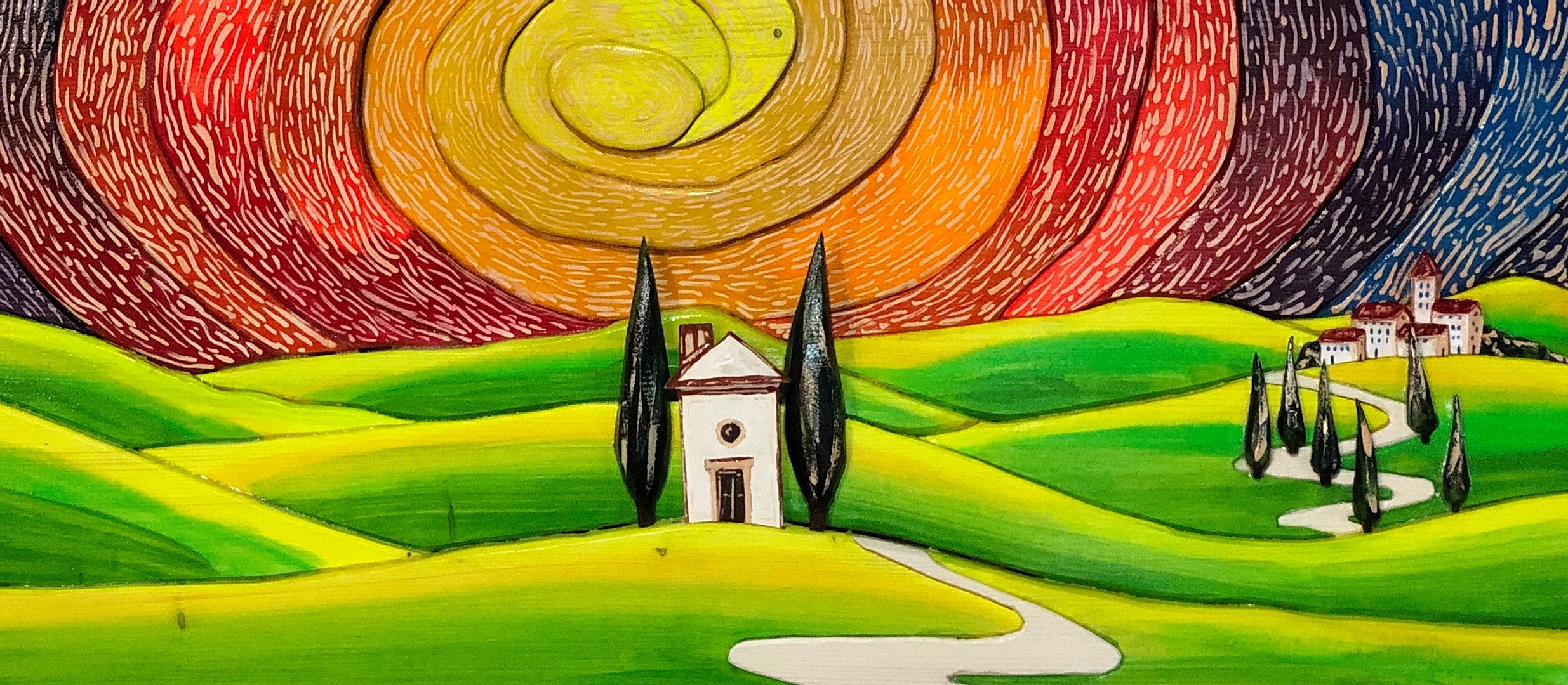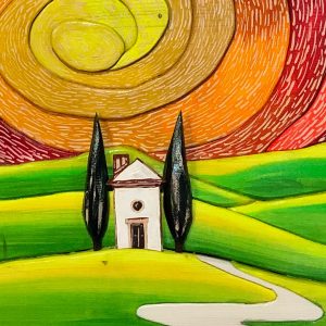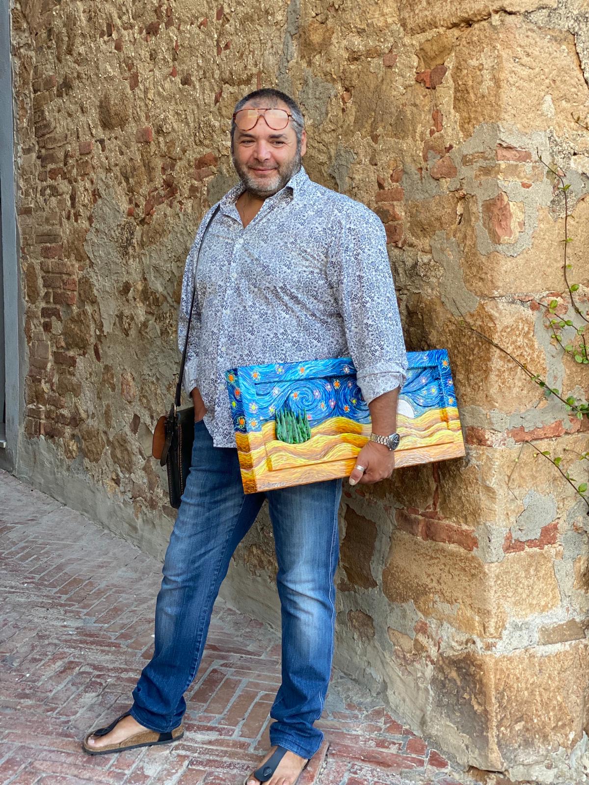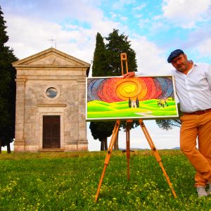 For some years now, he has worked in his own workshop SoterusArt in Torrita di Siena where he makes his “picture-sculptures”: decorative relief paintings and panels made by assembling various hand-painted pieces of wood. His works are distinctive for their surprising variety and brilliant colours: each work is a one-off piece and created with extreme technical precision and patience, using natural resins and colours made on the premises by the artist. His work starts from a sketch on paper which is then transferred onto wood; then he cuts, sands and colours each piece which are then assembled and mounted in a frame also made by the artist.