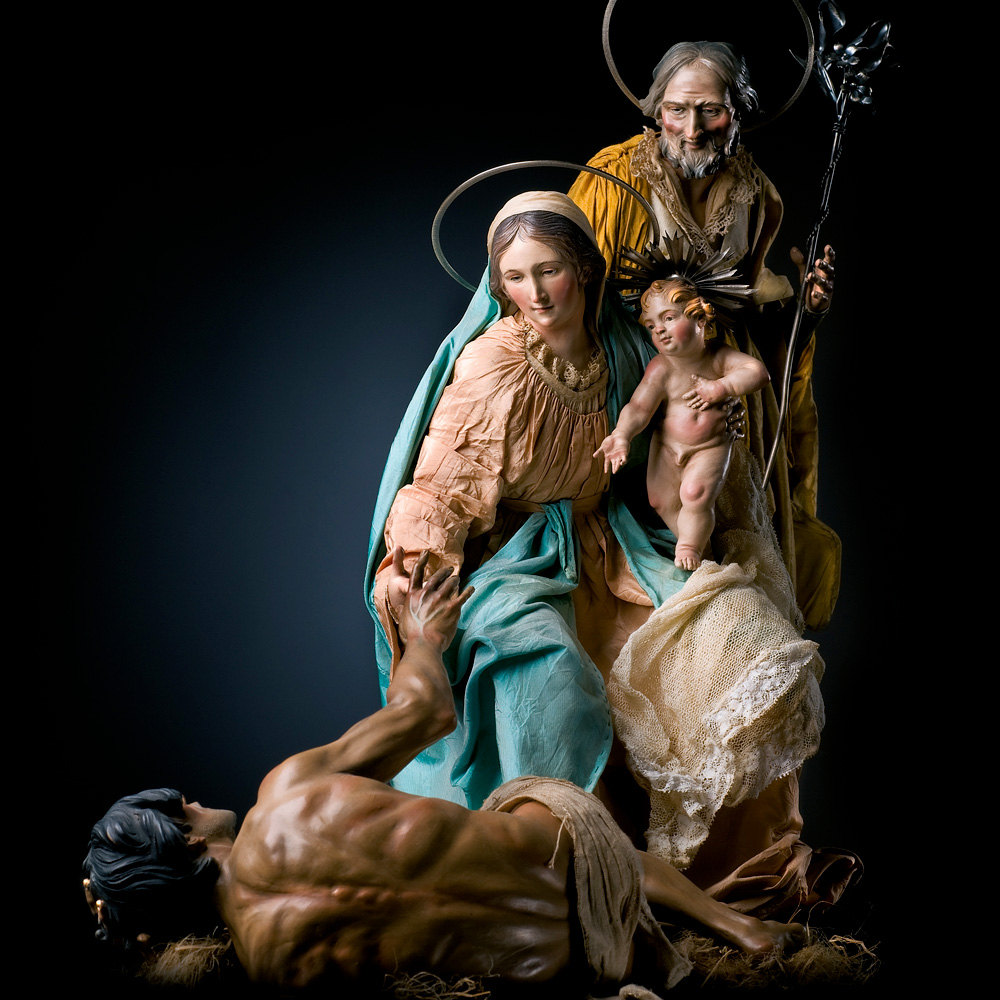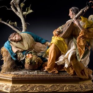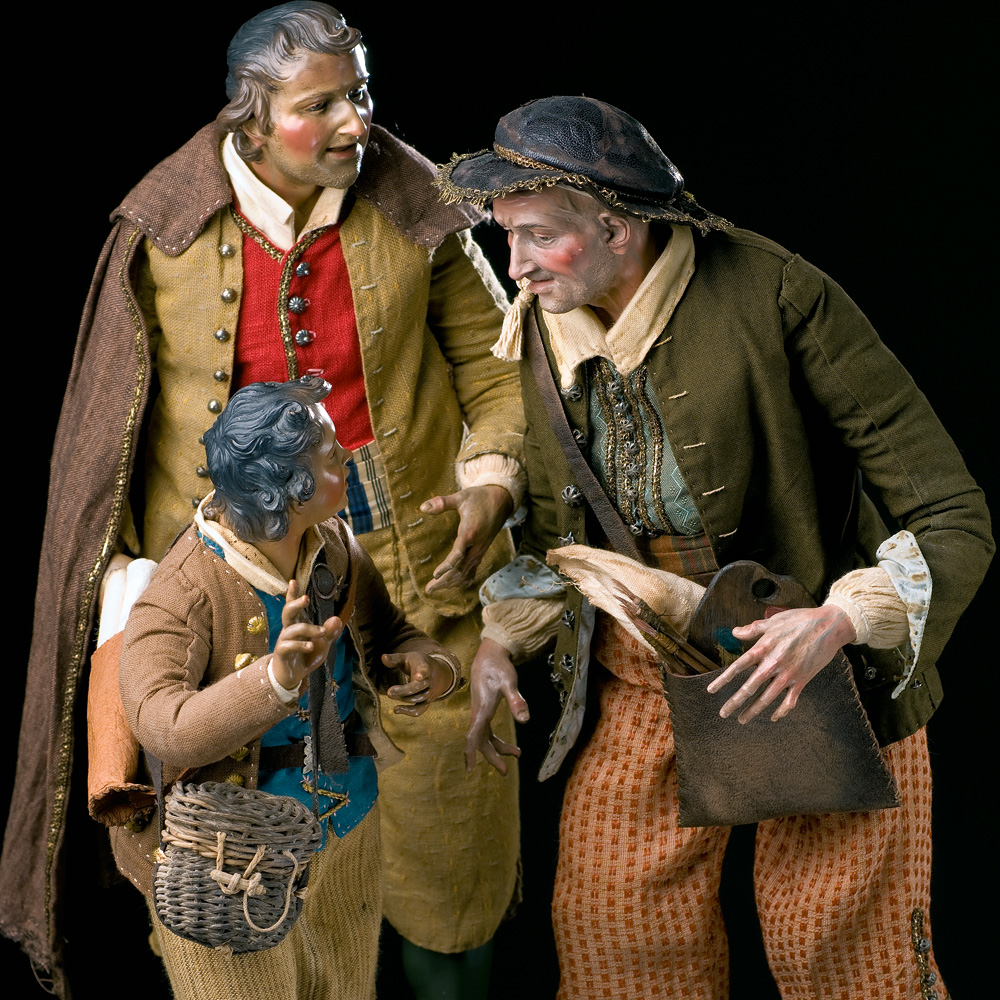 Ulderico Pinfildi was taught the art of making nativity scenes by observing his parents working with ceramics and earthenware. He then started to study the origins and history of these traditional compositions, the materials used, human anatomy and techniques of modelling. The sculptor then opened his own workshop in the historical centre of Naples where he brings to life the spectacular figures that are traditionally part of the nativity scene. For his compositions, he prefers the iconography of the 1700s; the rustic settings and neoclassical architecture of Naples under Bourbon rule. He abandons himself to the inspiration of the masters of Italian painting for his colours and figures, in particular the theatrical Caravaggesque gestures and the chiaroscuro composition of his settings.