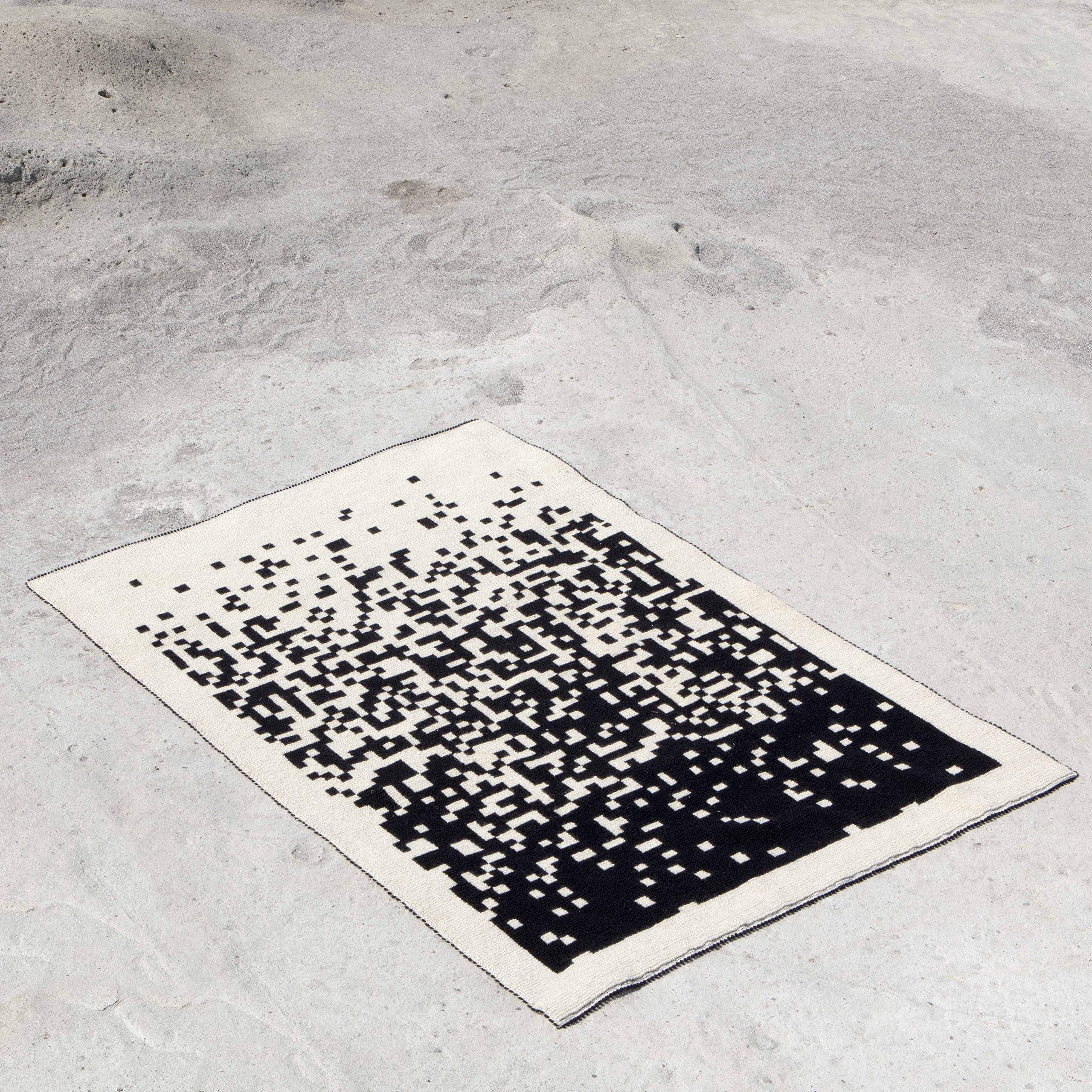 Tra i progetti che meglio rappresentano Mustras, uno è Q.R. Quanta Res, una tessitura a pibiones in lana progettata da Fabrizio Felici e Alberto Olmo. Il lavoro nasce dall’indagine sul concetto di memoria in relazione all’abitare, nello specifico in dialogo con il territorio di Seulo e la cascata di Sa Stiddiosa, luogo simbolico per la comunità locale. Il degradarsi “pixellato” della tessitura richiama lo sgocciolio – in sardo “su stiddiu” – dell’acqua e dialoga con l’idea del QR code come contenitore di memoria e dati.